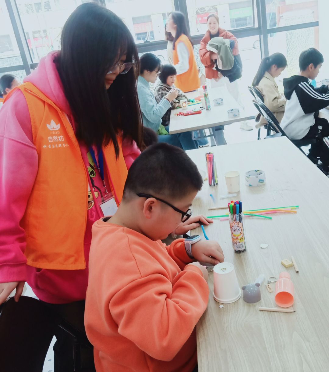 活动当天下午3点,小坊的志愿者们提前到达场地做好准备。活动开始,志愿者们向参与活动的孩子及家长详细讲解了变脸小丑纸杯的制作方法和注意事项。随后,志愿者为大家分发彩笔、纸张等制作材料,并进行制作演示,在志愿者们耐心细致的指导下,小朋友们与家长携手合作,共同投入到手工制作中。大家在掌握制作技巧的同时,亲子间的沟通交流不断升温,协作也愈发默契 。
