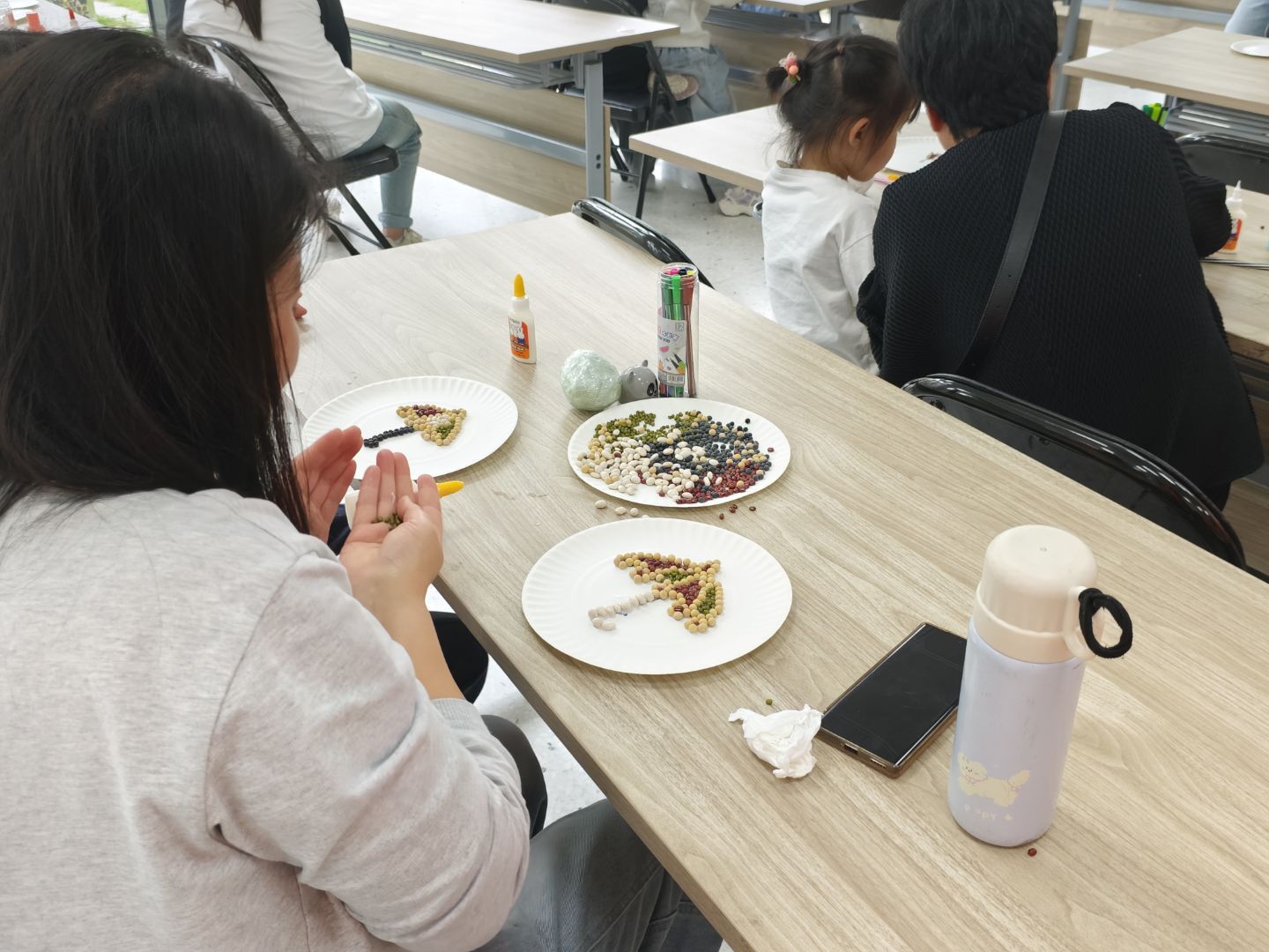 活动当日,公司老员工志愿者提前抵达场地,有序完成彩豆、卡纸、胶水等材料分发工作,并向参与家庭详细介绍创作流程与安全事项。在志愿者的耐心指导和家长的陪伴下,孩子们充分发挥创意,用形态各异的种子拼贴出一幅幅充满童趣的画作,将小满时节“物至于此,小得满盈” 的美好寓意定格于方寸之间。