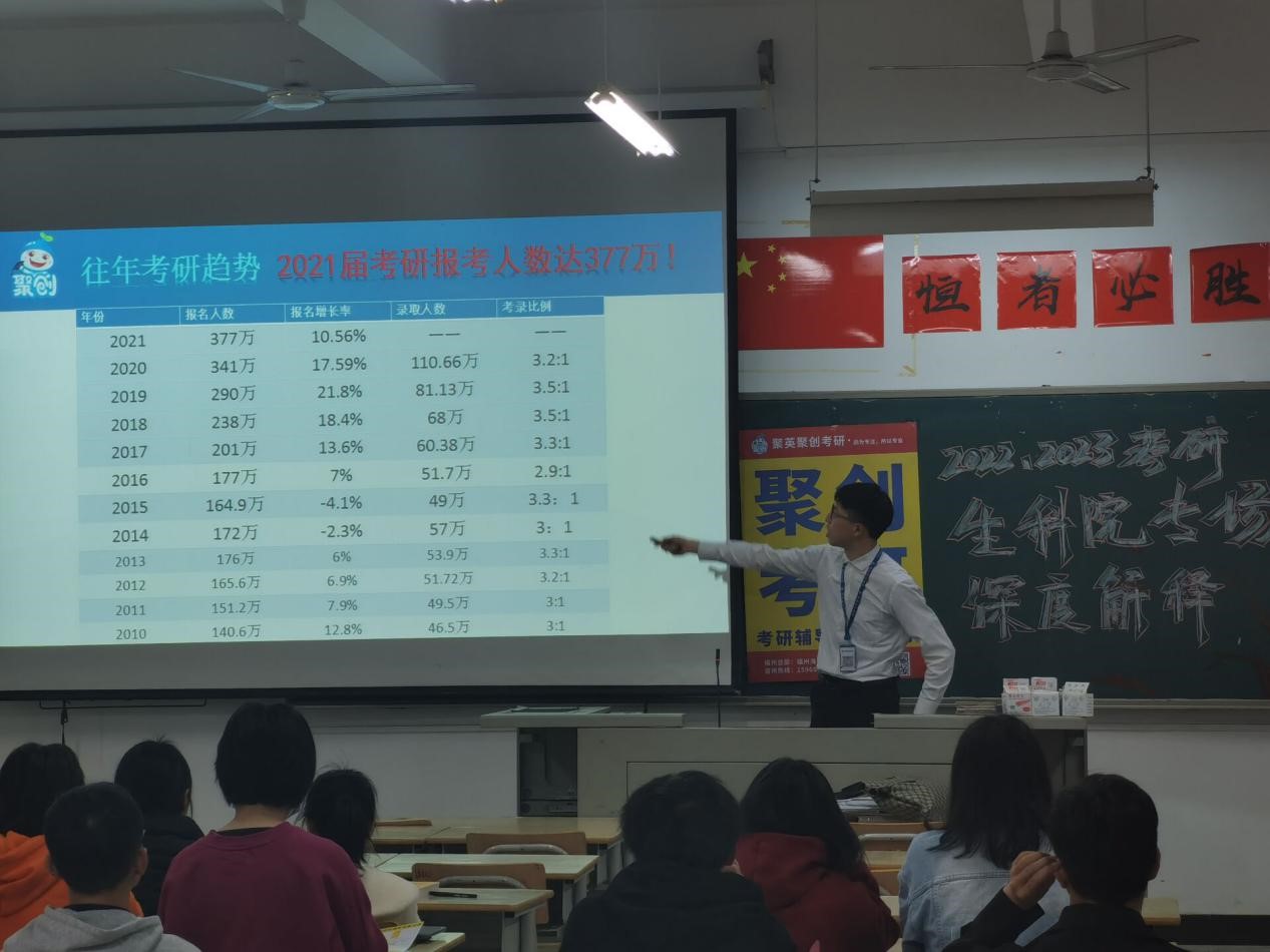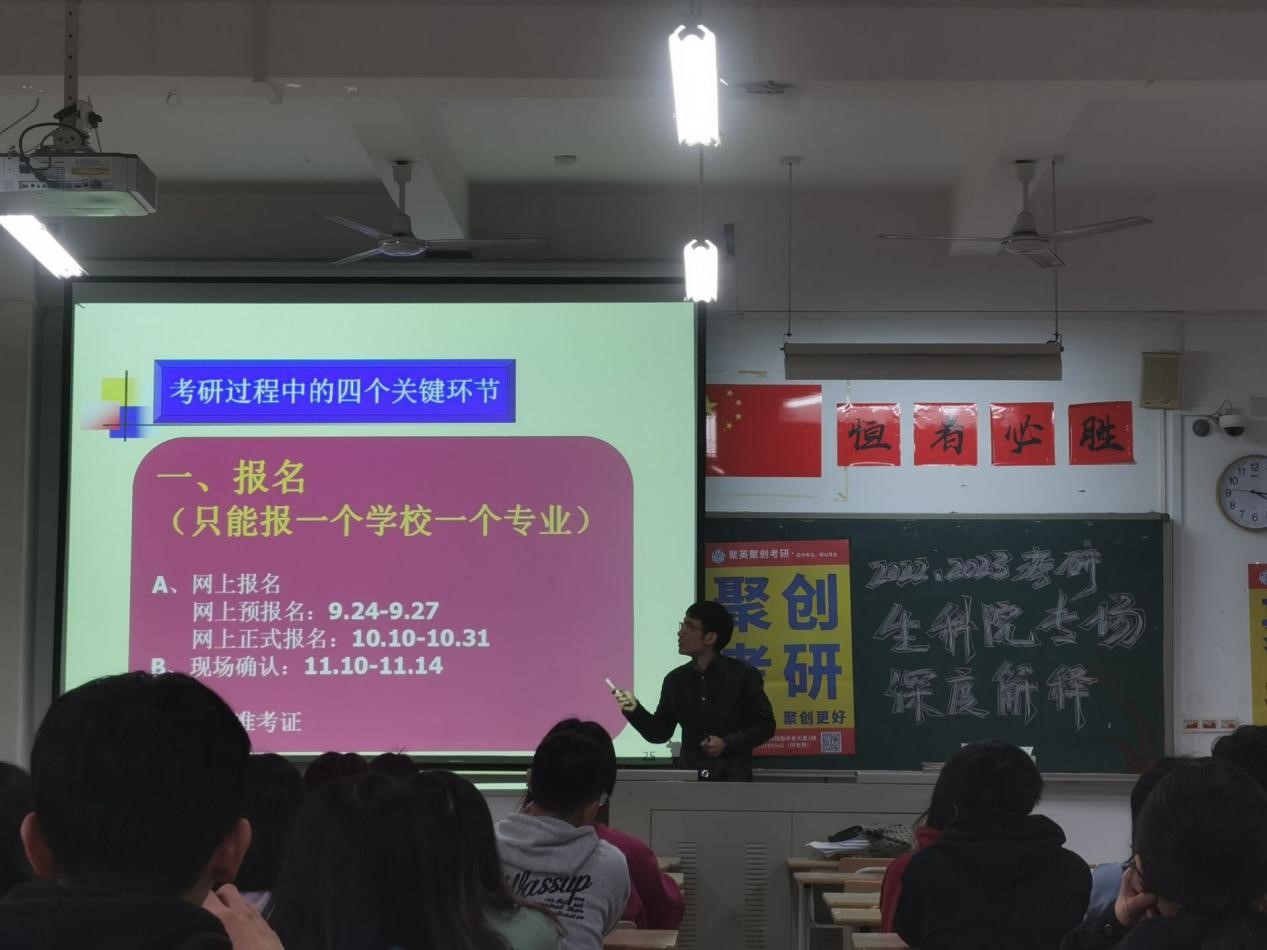会上,聚创考研分校曾老师就历年考研趋势和2021届考研情况进行了讲解。随后主讲人江斌围绕“哪些人需要考研、跨专业选择技巧、应届生考研报考条件、专业课压分”等四方面做了深入解析,并介绍了生物类员工的考研专业选择、对应专业的全国排名情况、生物类专业方向对口的就业岗位及考研过程四个关键环节。最后江斌对同学们提出殷切希望,鼓励同学们确定自己的目标和方向,并为之努力拼搏,最终取得理想的结果。