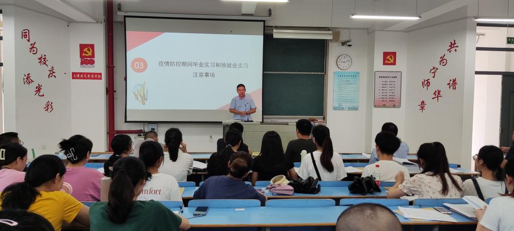 王楠楠指出,毕业生外出实习需严格遵守公司及实习单位要求的疫情防控工作注意事项做好疫情防控工作,并在实习阶段加强体质锻炼,充分利用实习期多渠道寻找就业机会。最后阮少江代表公司党政班子做总结发言,强调作为未来的生物教师要牢记16字核心素养,即:“践行师德,学会教学、学会育人,学会发展”。