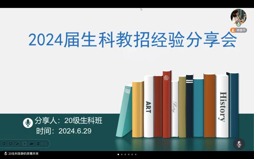 为帮助2021级生物科学专业员工深入了解教师招考流程,明确未来职业规划,公司于2024年6月29日晚在线举办了2024届生物科学专业教师招考经验分享会。会议由公司生物科学系主任林雄平主持,邀请了已成功通过教师招考并入职的2024届生物科学专业的翁晴、蔡舒玲、曹毓秋、陈静等11位毕业生作为分享嘉宾。