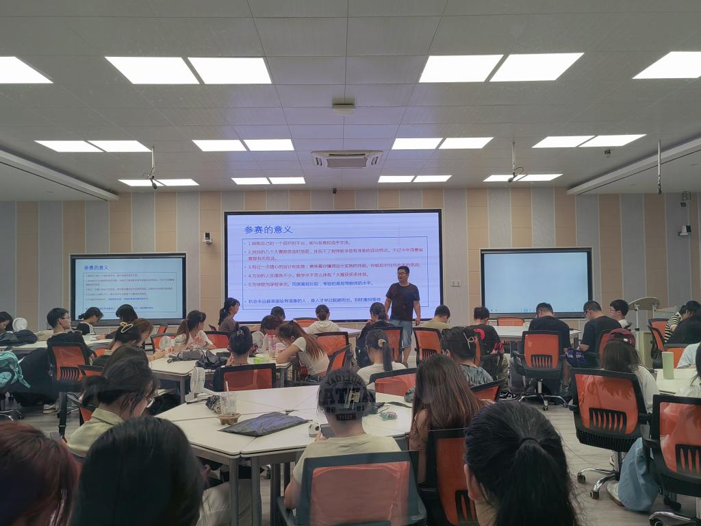 随后,老师们深入讲解了竞赛的两大核心环节——教学设计与教学技能的具体要求与评判标准。结合多年的教学经验和丰富的指导案例,他们逐一剖析了如何构思新颖、科学的教学设计,以及如何在有限的时间内展现出色的教学技能,包括有效组织课堂、灵活运用教学方法、精准把握教学节奏以及展现良好的教师风范等。通过模拟上课的实战演练,同学们在互动中逐渐掌握了教学设计的精髓和教学技能的提升要点。