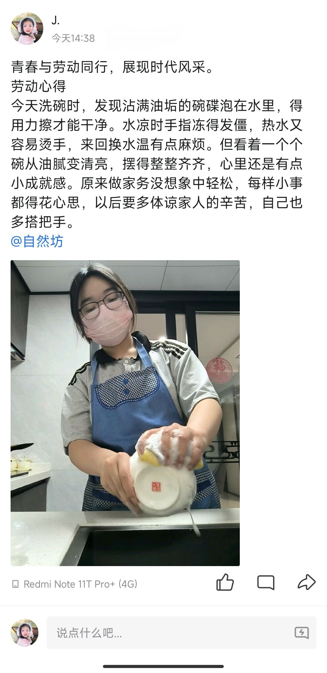 家务劳动记录活动得到员工积极响应。五一假期期间,许多员工在参与家务劳动后,将劳动场景和成果拍摄照片,通过QQ空间分享实践心得。这项日常化的劳动实践有效提升了员工的劳动意识,也培养了感恩意识和家庭责任感。