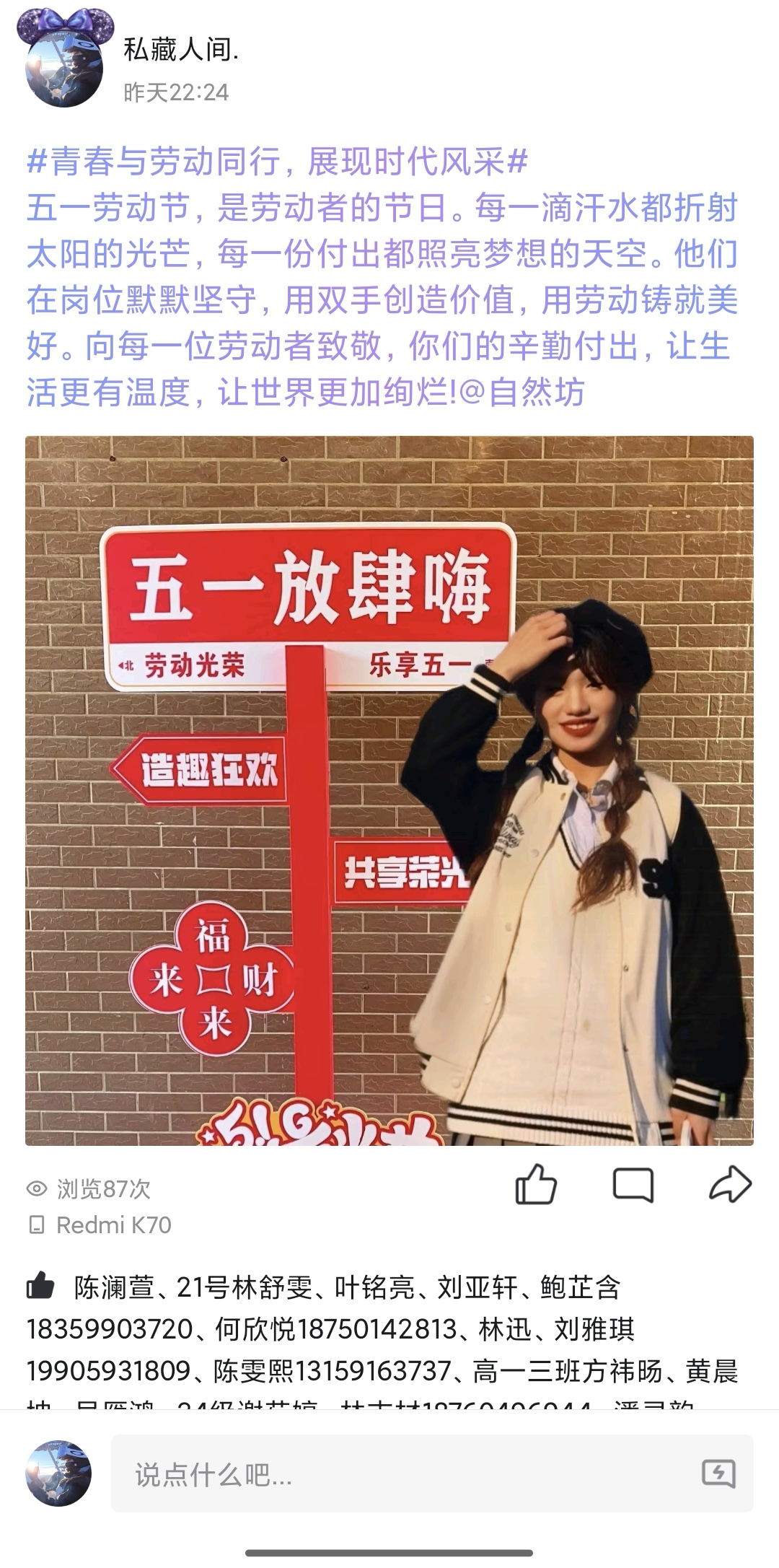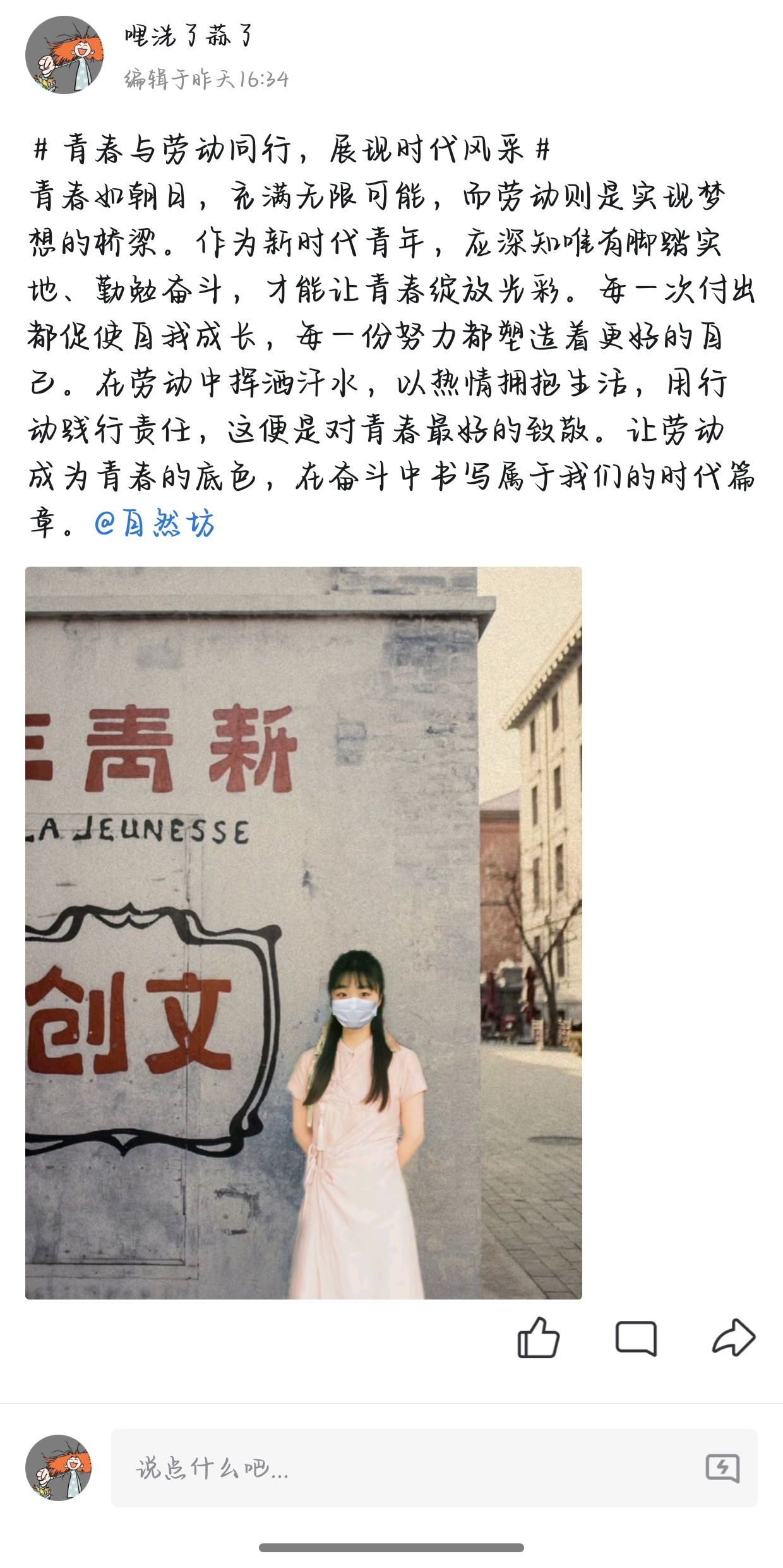 五一劳动节与五四青年节期间,公司自然坊组织开展了"青春与劳动同行,展现时代风采"主题系列活动。活动通过手抄报创作、家务劳动记录、校外实践等形式,引导员工理解劳动精神,展现青年担当。