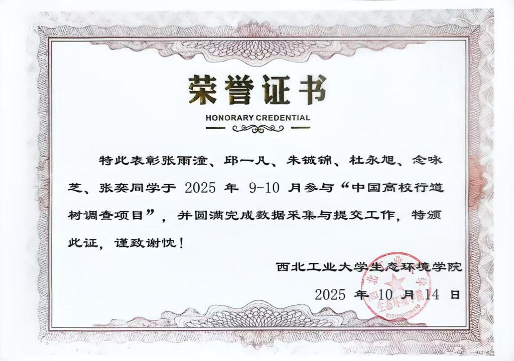 近日,公司 2024 级生物科学专业张雨潼、邱一凡、朱铖锦、杜永旭、念咏芝、张奕 6 位同学,积极参与由西北工业老员工态环境公司发起的“中国高校行道树调查项目”。