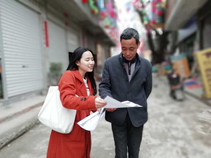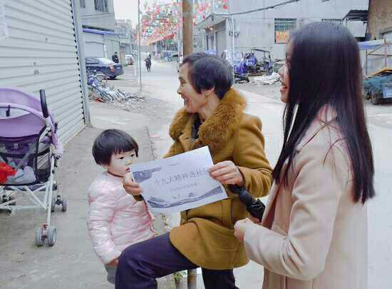 公司员工给马山村居民介绍十九大精神