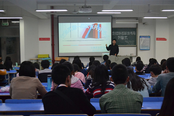 4月25日晚19:00分,生物系首届读书月开幕式在求实楼CC201举行。据悉,此次读书月系列活动有:图书漂流站、书画展比赛、“微小说,微世界”文学征文、朗诵比赛、“书香云集”摄影展览、名师讲坛、手绘第一届读书节节徽设计、文明阅读班级的评比暨闭幕式等。