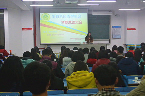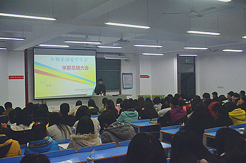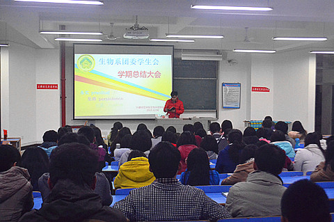 2015年12月30日晚上19:45分,生物系团委员工会学期总结大会于求实楼CC201召开。参加本次会议的有王永吉老师、团委员工会各部门部长和副部长、全体干事成员。会议内容包括揭晓系员工会Logo、各部门学期工作总结以及下学期工作计划。首先Logo设计者邓湘凌同学上台向大家解释会标的设计理念,展示了一个温暖的团委员工会大家庭的Logo。接着各部门部长及副部长总结汇报了一学期中部门内部所开展的各项活动,在肯定活动中取得的成绩的同时,各部门也都提到了存在的不足之处,也针对活动中出现的问题提出改进方案,希望在以后的工作中做得更好。
