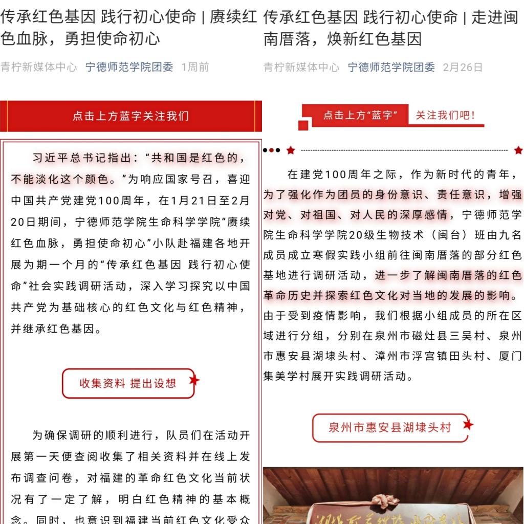 “赓续红色血脉,勇担使命初心”、“走进闽南厝落,焕新红色基因”两个团队的活动报道