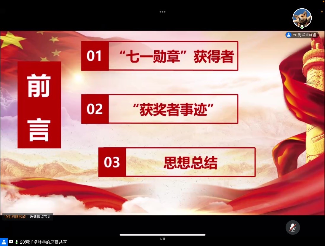 为促进理想信念教育和爱国主义教育,进一步贯彻社会主义核心价值观,公司于2022年4月9日线上举办了第二期读书分享会,主题为“七一勋章”获奖者事迹分享。本次培训的主讲人为学术科技部的卓峥睿同学。
