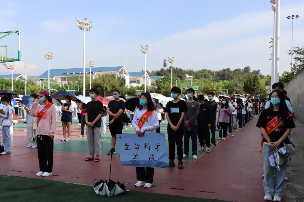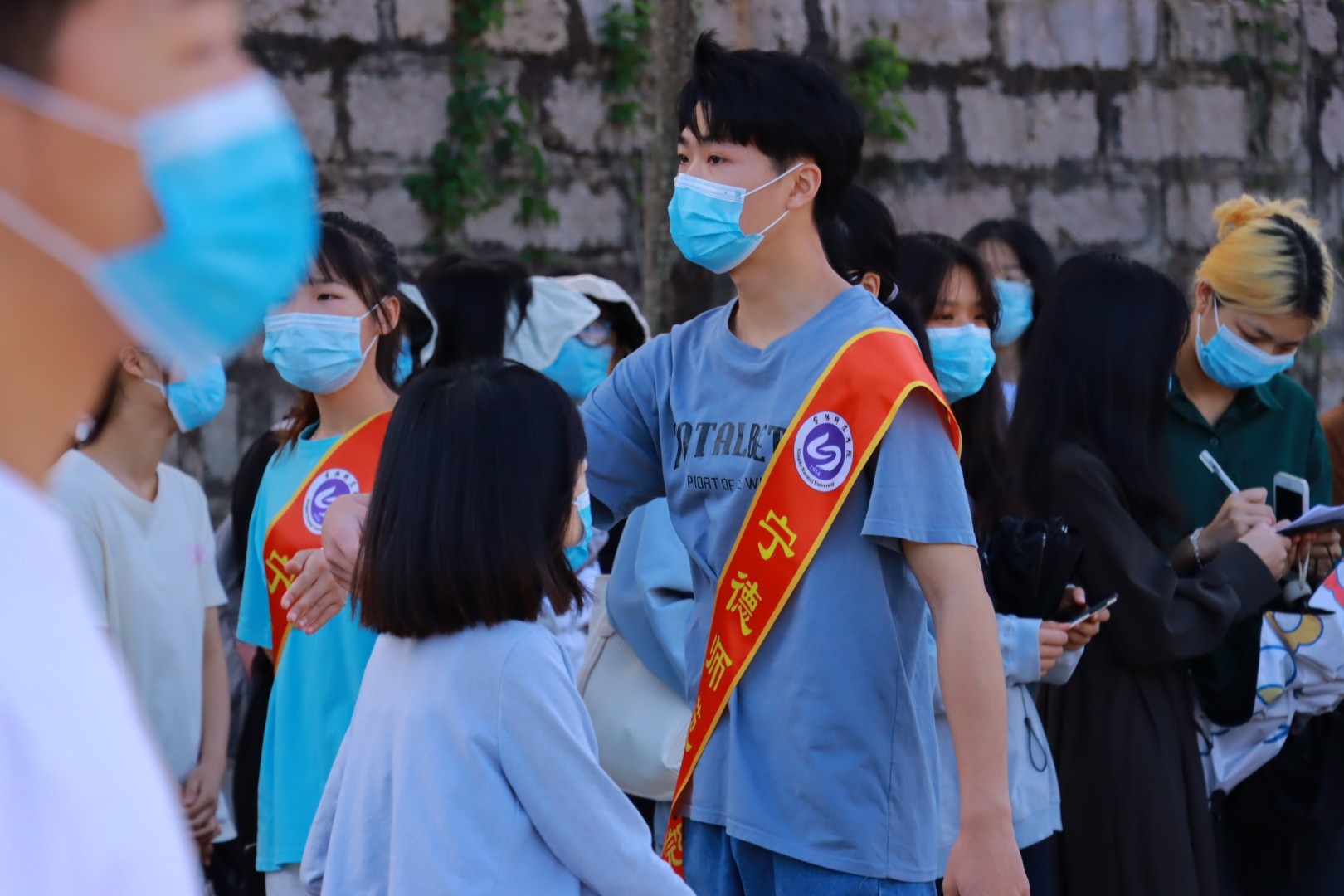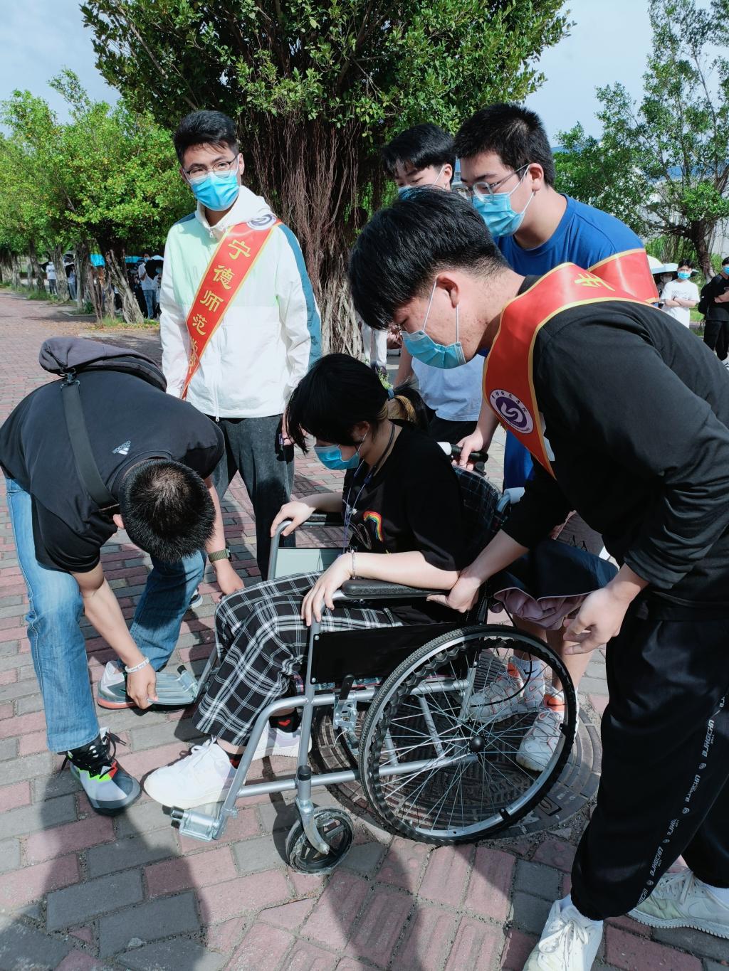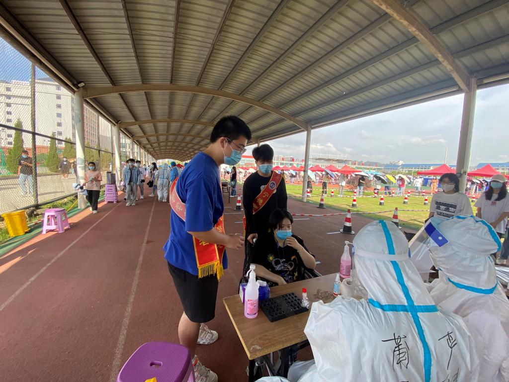 在每日核酸检测中,21名突击队成员维护现场秩序,引导同学们到指定地点排队,提醒各班同学保持一米距离、有序入场,确保核酸检测顺利、高效地进行。在4月15日第六轮核酸检测中,一名员工突发身体不适,员工党员林诺滨迅速前往医务室取来轮椅,并与员工党员林斌一同将该生护送至核酸检测点,面对紧急状况,他们从容不迫、以身作则,关键时刻挺身而出,体现了党员的先锋模范作用,展现了青年防疫突击队强大的凝聚力、执行力。
