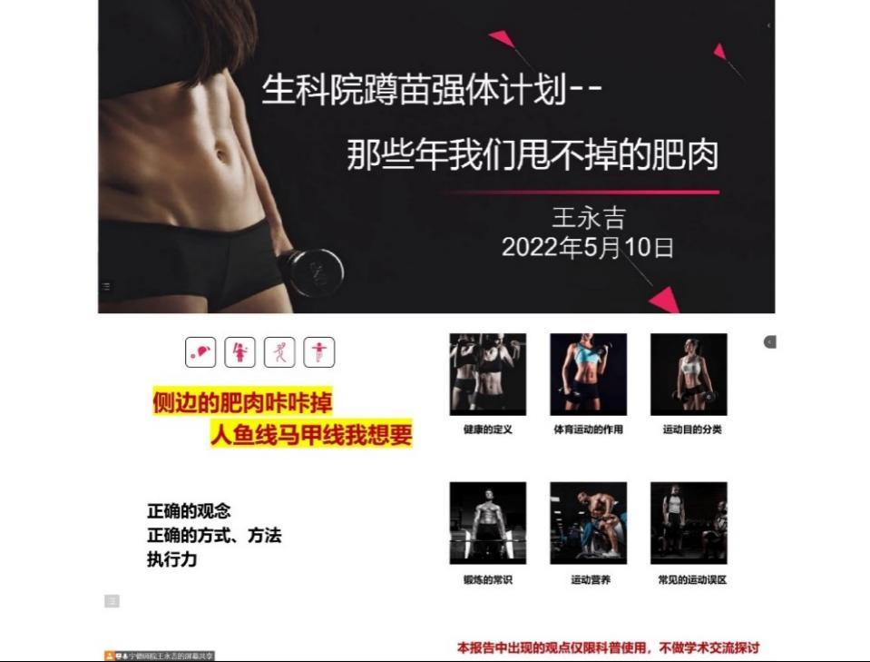 为引导员工在体育锻炼中享受乐趣、锤炼意志,公司于2022年5月10日线上举办了体育知识分享会——“那些年我们甩不掉的肥肉”,主讲人为院团委书记王永吉老师。