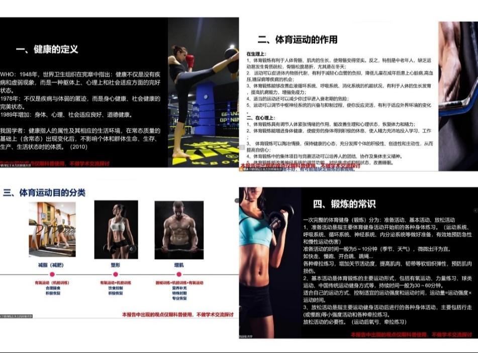 首先,王永吉老师强调要想塑造好体型,必须要有正确的观念、方式和方法,更要有执行力,并从六个方面展开分享。一是健康的定义,详细讲述了健康在医学和体育范畴内的定义与侧重点,以及体质、体适能等概念。二是体育运动的作用,提到体育运动能改善生理和心理状态,大幅度促进身心健康发展。三是体育运动目的的分类,主要分为减脂(减肥)、塑形、增肌三种。四是锻炼的常识,他表示要穿戴合适的运动装备,并要针对不同项目而更换,而后指出一次完整的体育健身包括准备活动、基本活动、放松活动。五是运动营养,他分别讲述了六大营养素——蛋白质、脂类、碳水化合物、维生素、矿物质、水以及膳食纤维的食物来源和功能,并分享了国内运动营养食品的分类。六是常见的运动误区,如跑步长肌肉腿是否会变粗,筋膜枪、泡沫轴能否替代拉伸,为何吃的不多会长胖以及瘦并不等同于美,体重轻也不意味着健康等话题。