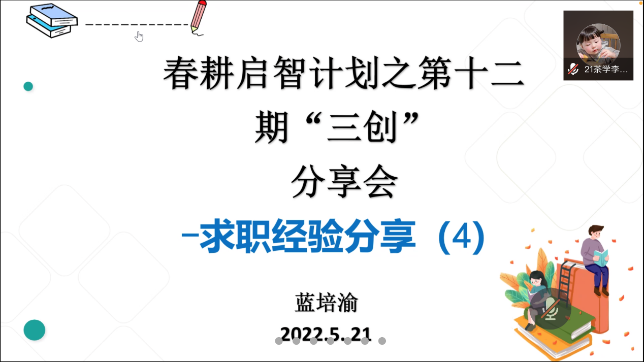 为进一步培养与提高老员工求职相关技能,公司在2022年5月22日线上举办了第十二期“三创”分享会,此次主持人为2018级蓝培渝同学。