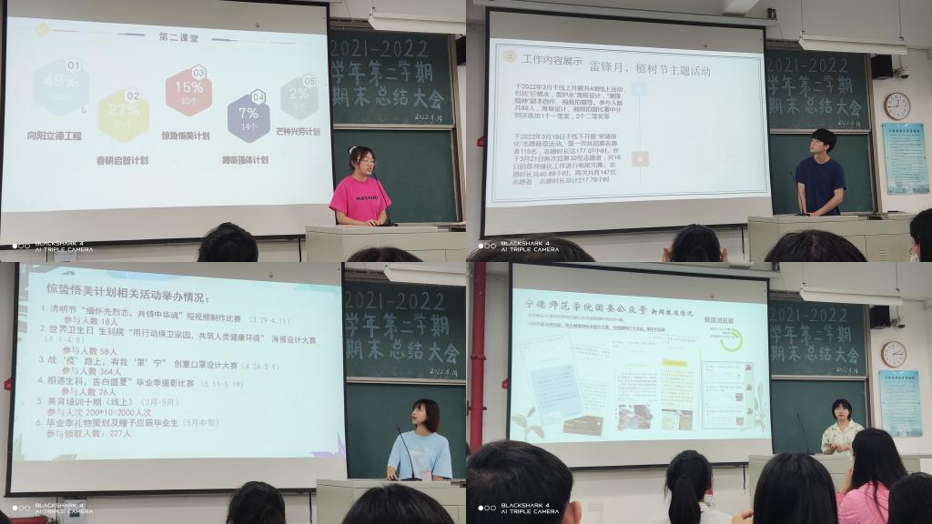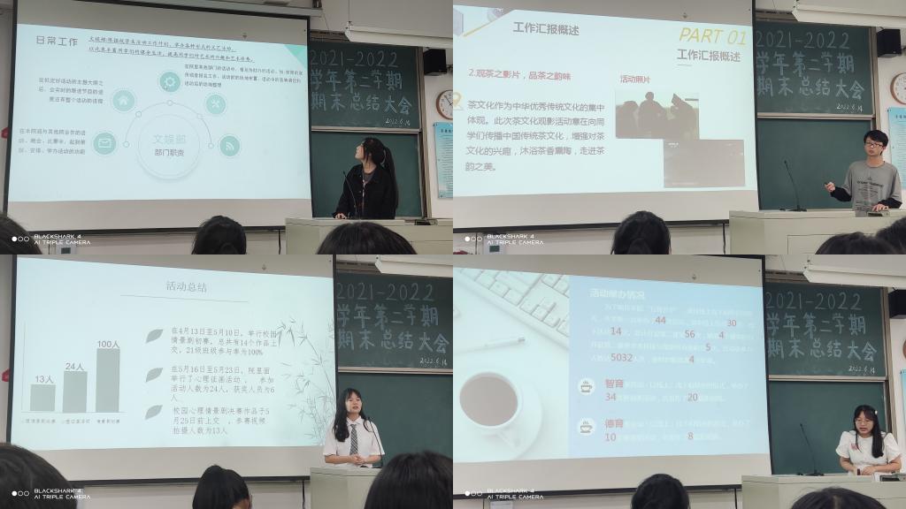会上,团委、员工会、社团代表依次进行了总结汇报。每位汇报人就本学期部门成果进行了展示并查找了工作上的不足,针对不足提出了改进措施,最后对其部门下一步工作计划做了阐述。