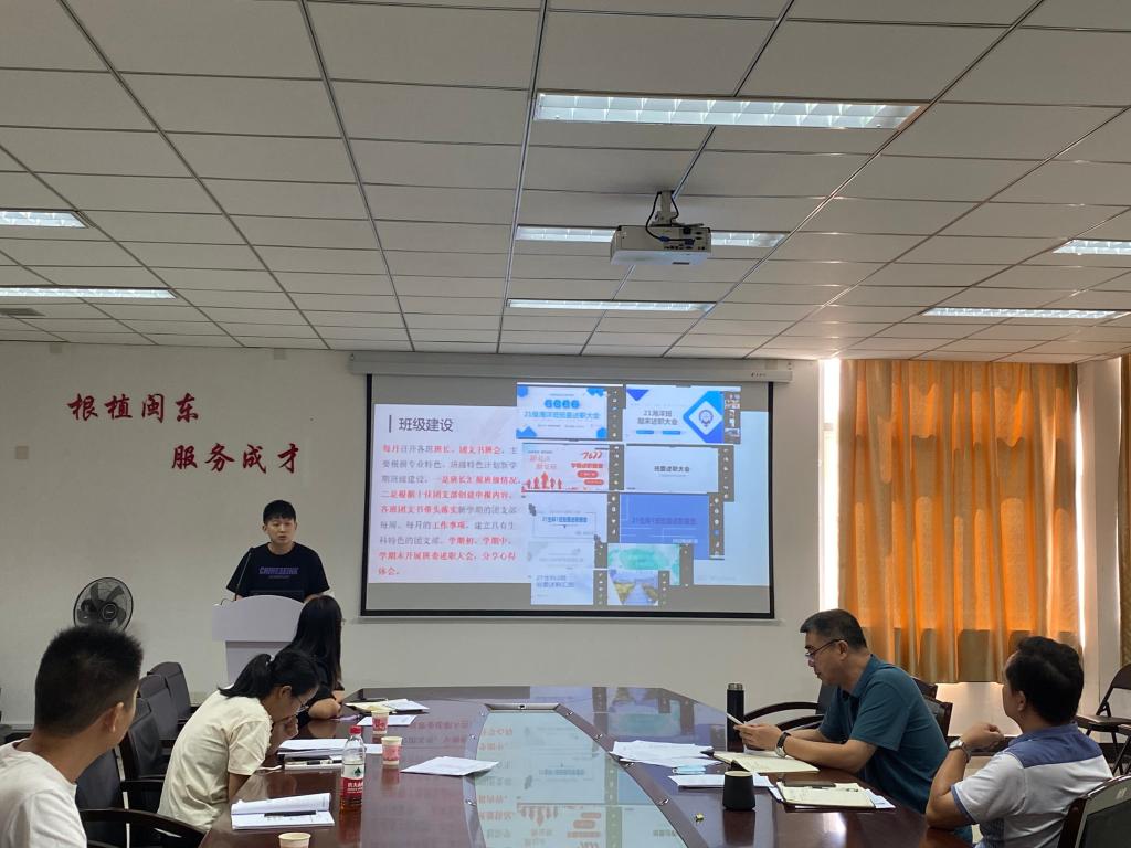 辅导员王永吉、林维杰、李卓霖、王珂、林慧分别汇报展示了2021-2022学年中的工作总结、工作经验、工作反思及下学年计划,并根据所负责情况阐述了向阳立德工程、春耕启智计划、蹲苗强体计划、惊蛰悟美计划、芒种兴劳计划的具体实施情况,为新学期深入贯彻落实五育并举、立德树人根本任务夯实了基础。