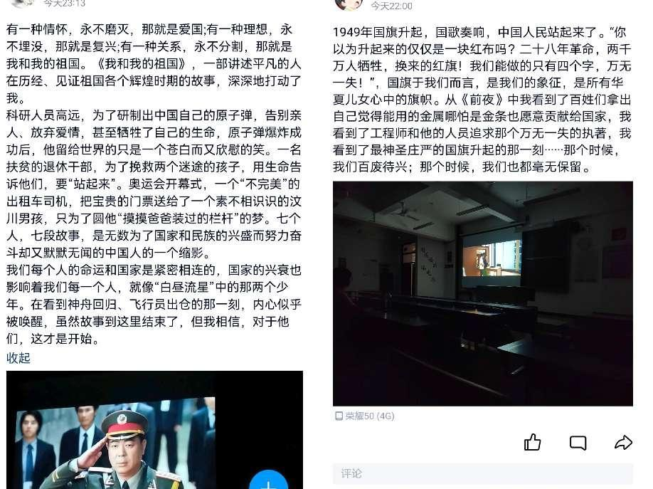 观影结束后,同学们纷纷发表了自己的感想。其中,21级生物科学2班戴欣怡同学说:“我看到了百姓们拿出自己觉得能用的金属哪怕是金条也愿意贡献给国家,我看到了工程师和他的人员追求那个万无一失的执著,我看到了最神圣庄严的国旗升起的那一刻……那个时候,我们百废待兴;那个时候,我们也都毫无保留。”22级生物科学1班朱甜甜同学说:“我要将中国这种默默无闻的精神传承下去。虽然有时为祖国奉献,却无人知晓,但为祖国奉献自己的那份力量却是值得的,我们的幸福生活来之不易,我们有职责,有义务也有激情与活力去努力学习,让我们的祖国更加繁荣昌盛,让祖国这条腾飞的巨龙腾跃发展,让千千万万的中华儿女为之奋进,让我们为这新中国,日新月异的变化而骄傲自豪。”