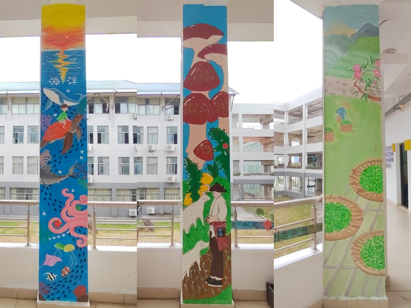 活动在同学们的积极参与下,征集到了一幅幅优秀作品,展示着同学们的才华和青春风采。经过评比,选出了三幅获奖作品作为公司C区大厅门柱墙绘画。在一众优秀作品中,《先苦后甜》绘出了一种生活态度,一种乐观向上、吃苦是福的人生哲学;《海洋》绘出了人与自然和谐共生的画面;以及《生之“蘑”力》绘出了蘑菇的亭亭玉立,灵性鲜活。随后同学们把纸上画搬至墙面上,在墙上留下了茶的苦中有甜、海洋的包容万物和菌菇的生机盎然,展现出自然气息与活力,更体现宁德丰富的生物自然资源。
