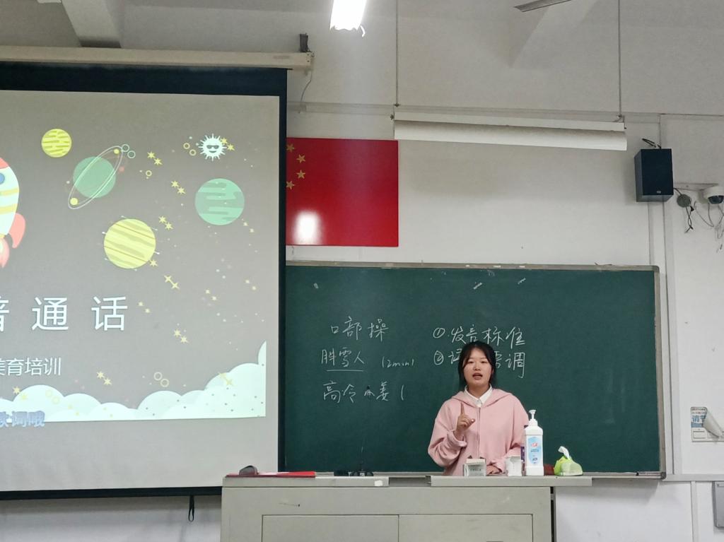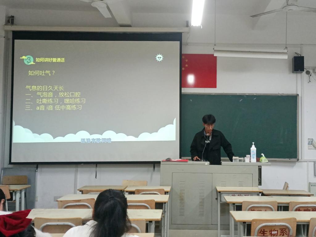 活动上,黄金铭主要从四个方面入手,一是解释普通话的定义;二是讲述如何讲好普通话,他以四声歌为例,现场邀请同学将它读出来,并一一纠正他们的读音,要求发音标准,注重语音语调,从而做到吐口如珠;三是从气息的练习上改进同学们的发声,现场为同学们示范气泡音、吸气吐气等技巧;四是指出朗诵与演讲的规范标准。而后徐志慧也分享了口部操和绕口令两种方法,帮助同学们更好地学习普通话。