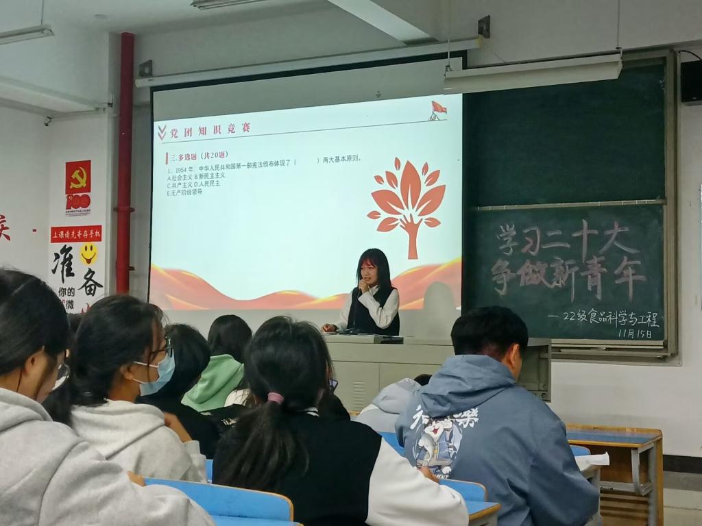 为深入学习宣传贯彻党的二十大精神,进一步创新学习方式、优化学习效果,增强青年员工队伍凝聚力,加强思想政治建设,促进老员工学深悟透党的创新理论,公司2022级食品科学与工程1班和2班全体同学于2022年11月15日晚在CC201开展“学习二十大,争做新青年”知识竞赛活动。