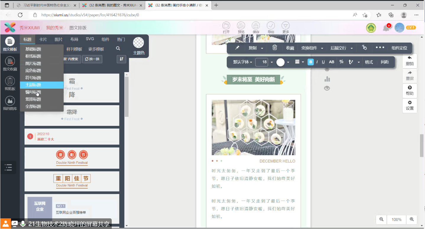 美育之目的,在陶冶活泼敏锐之性灵,养成高尚纯洁之人格。为提升员工审美素养、陶冶情操、温润心灵,提高公司员工的公众号图文制作能力,促进在校园里形成敢于创新创造的氛围。公司于2022年11月29日线上举办了2022-2023学年第四期美育培训之公众号制作。本次培训的主讲人为院员工会组织宣传部陈晓坪。