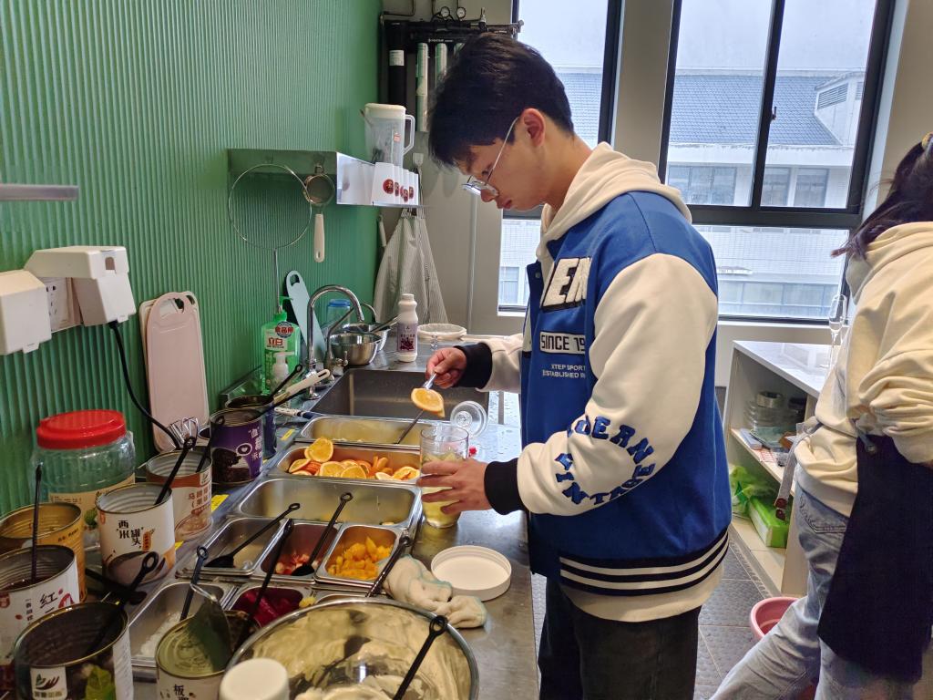 活动开始之前,茶协会成员于3月17日在新食堂门口设置宣传点,对活动进行宣传,极大激发了本院员工对此次调饮活动的热情。3月18日,围绕主题“春茶一口鲜,胜过三月天”,茶协会成员为同学们准备了水果、茶叶、牛奶等材料并向大家演示了果茶与奶茶的制作方法。制作 “桃之夭夭”应在雪克杯中加入适量冰块、茉莉茶汤、白桃果酱与果糖,摇匀混合即可。制作红茶底奶茶应加入适量植脂末、糖浆、茶汤和冰块,摇匀混合即可。工作人员强调,饮品装杯的时候最多为九分满,如若太多,在搅拌或者移动的时候都比较容易溢出。在工作人员的耐心指导下,同学们尝试设计与制作专属于自己的果茶或奶茶。