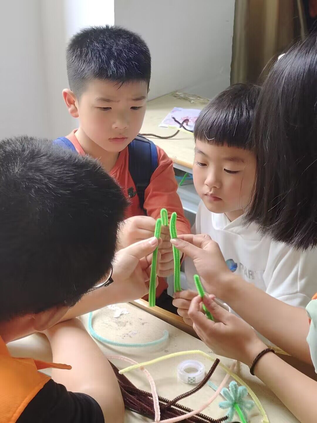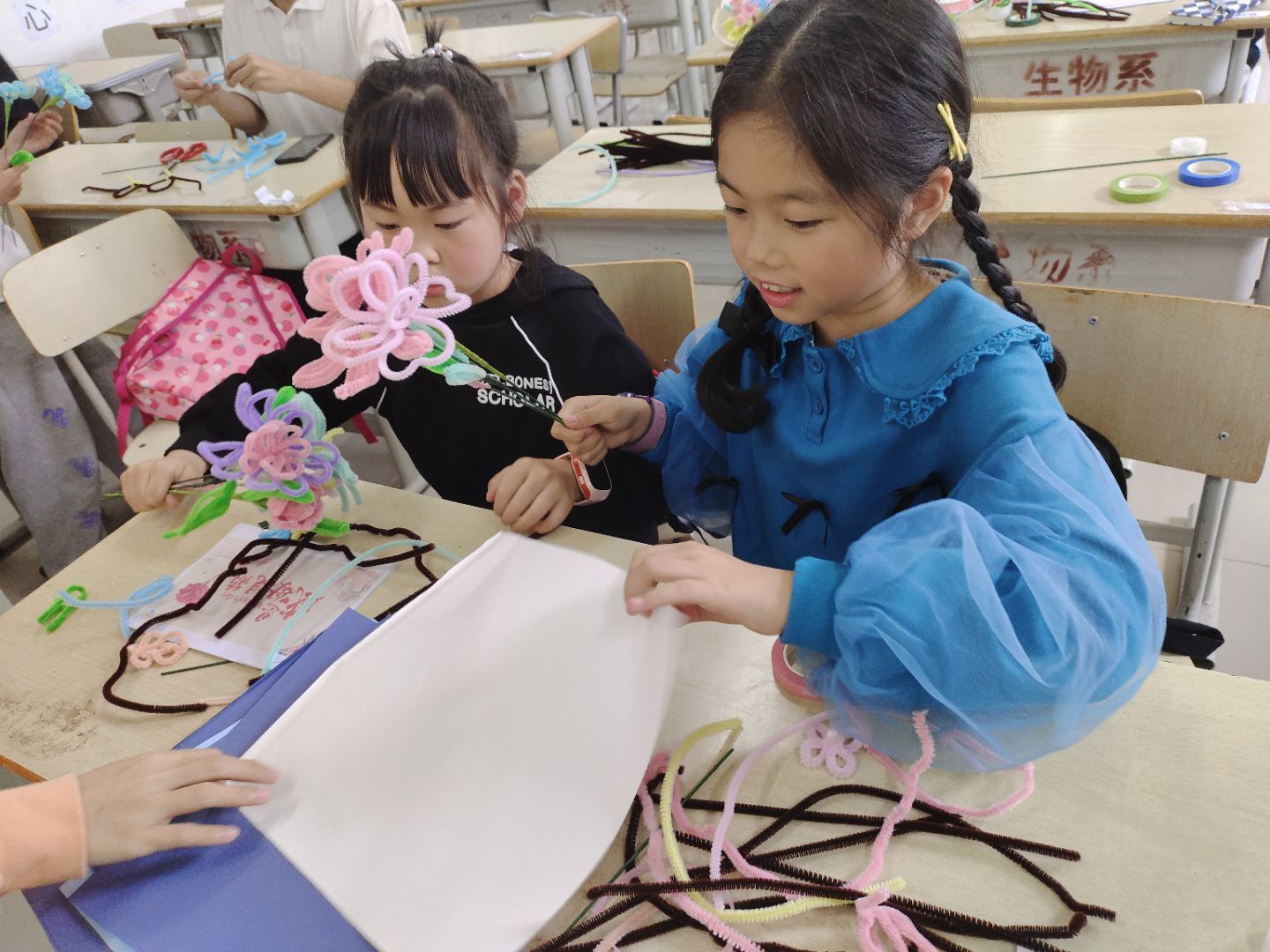 下午两点,手工花束活动正式开始。活动有12位小朋友参与,首先由梁翠娟科普母亲节知识,介绍手工花束的制作过程和活动注意事项。而后,小朋友跟着志愿者学习制作,先分别做出花瓣和叶子,再用胶带把它们拼接成一束美丽的花。除此之外,还有小朋友心灵手巧,制作出可爱的小蜜蜂小蝴蝶,在花束上装饰。最后在社团志愿者的帮助下,给花束包装,小朋友们都成功制作出了手工花束,并在贺卡上写上了对妈妈的祝福。