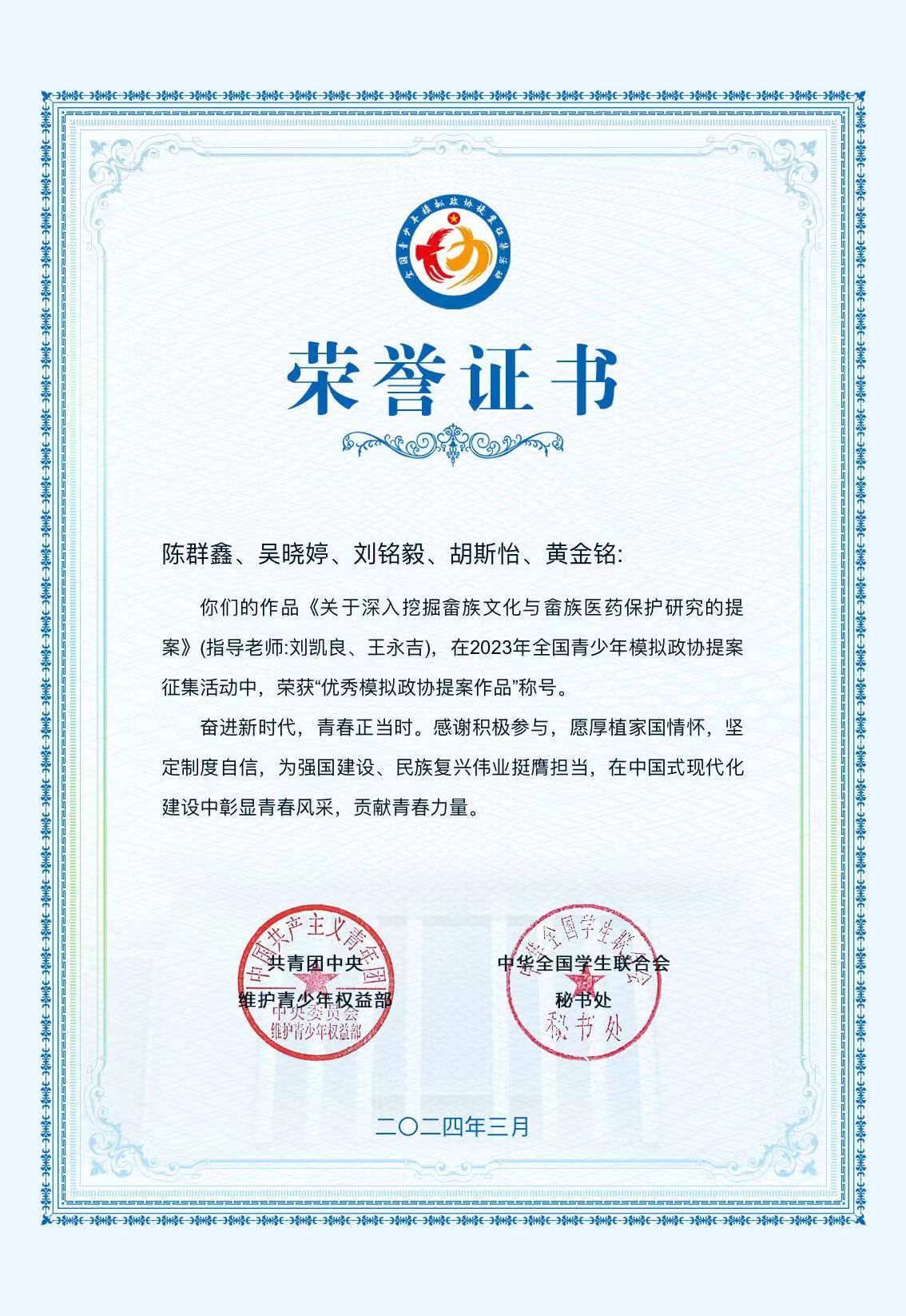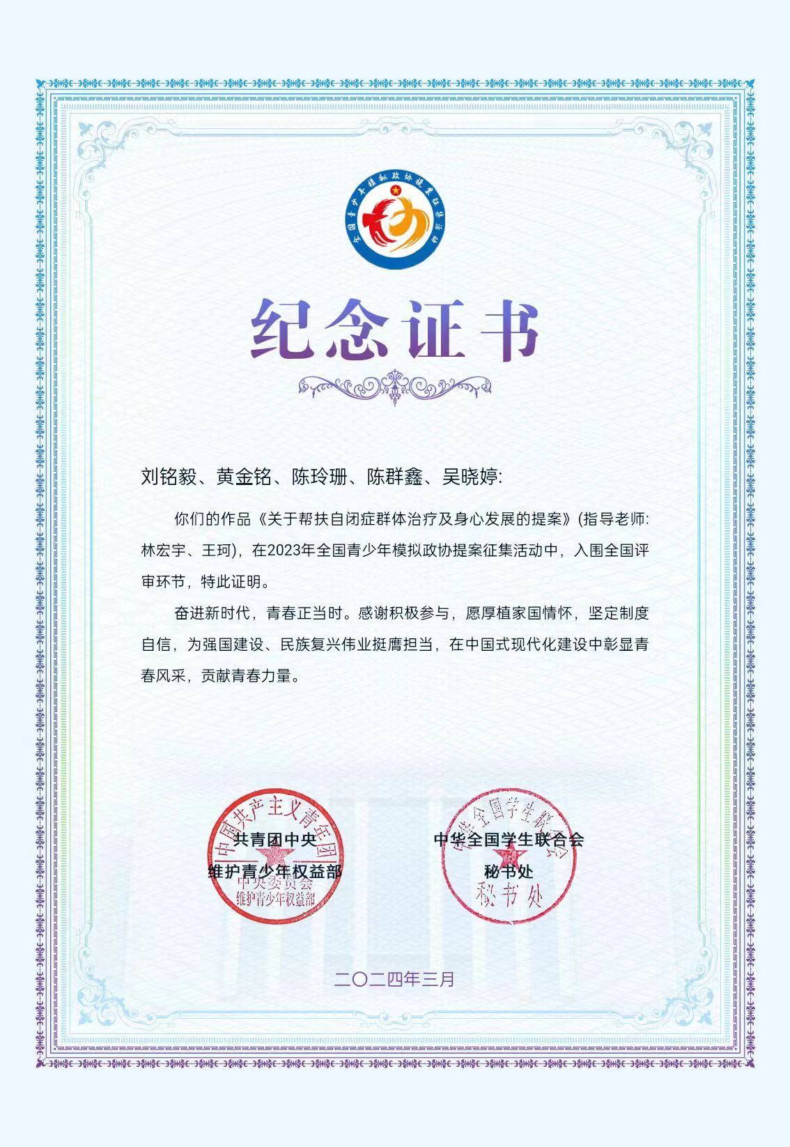 在875件推至全国评审的模拟政协提案作品中,公司陈群鑫、吴晓婷、刘铭毅、胡斯怡、黄金铭撰写的《关于深入挖掘畲族文化与畲族医药保护研究的提案》(指导老师:刘凯良、王永吉),最终获得全国大学组“优秀模拟政协提案作品”;由刘铭毅、黄金铭、陈玲珊、陈群鑫、吴晓婷撰写的《关于帮扶自闭症群体治疗及身心发展的提案》(指导老师:林宏宇、王珂),最终获得福建省大学组“优秀模拟政协提案作品”。