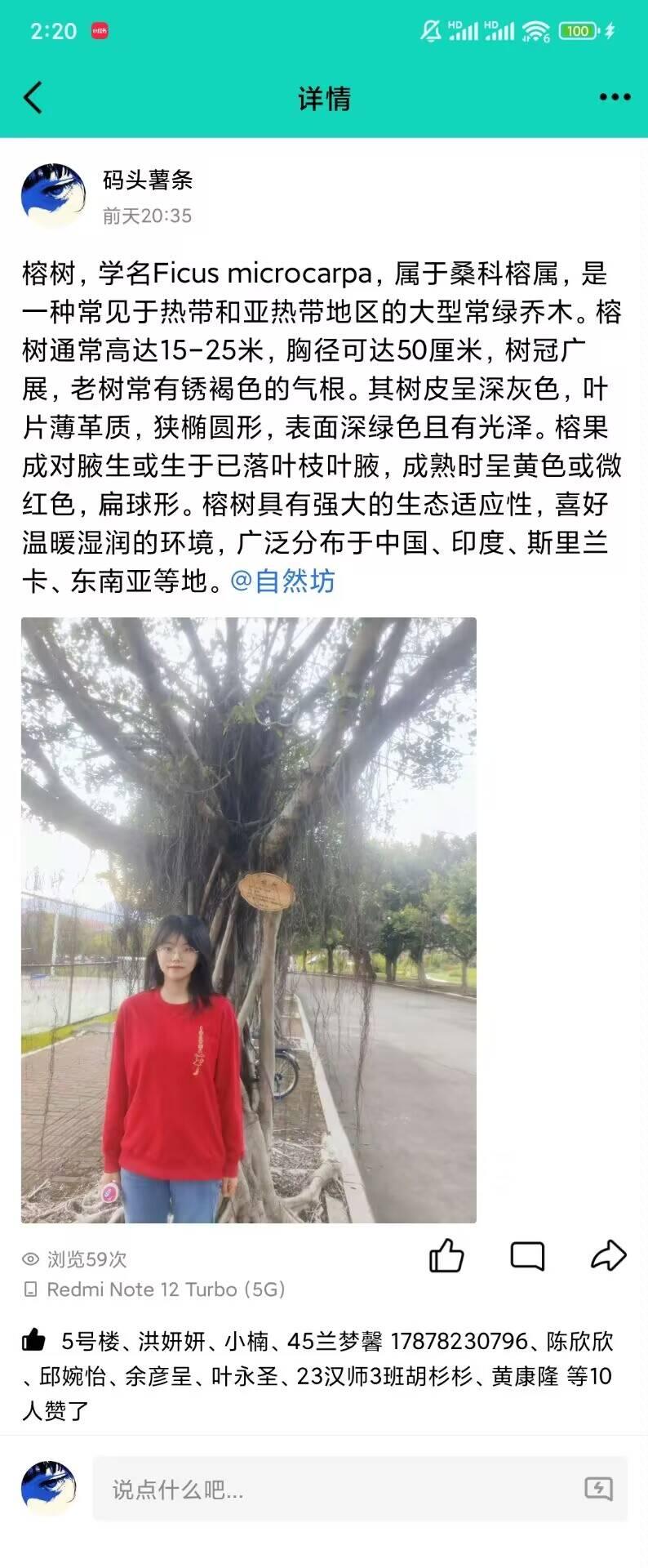 本次活动面向全体员工,主题是“自然之光,科学之光”。活动分为三部分:一、校园内植物打卡活动,11月4日-7日,员工与校园里的植物合照打卡并发布QQ空间,空间内容包括植物名字、对本植物的了解和认识并@自然坊的官Q。二、线下观影活动,11月5日下午15:00,员工在求实楼C区201进行线下观影活动,观看影片《风之谷》。三、植物科普节讲座,11月9日下午14:30,在求实楼C区201举办植物科普节讲座,由自然坊指导老师刘凯良老师主讲,分享植物科学保护、生态平衡维护相关知识。经过六天时间,本次活动圆满完成。