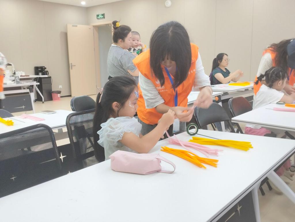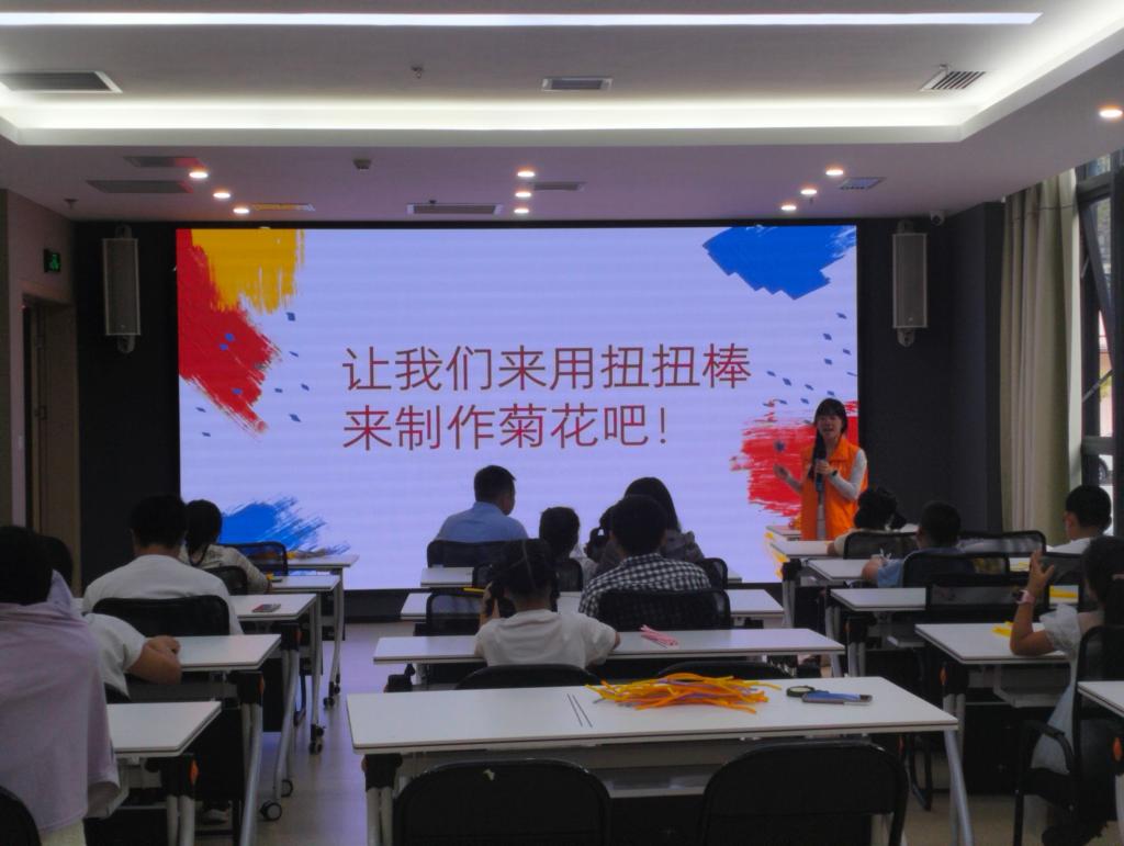 活动当天,自然坊的志愿者们首先向在场的家庭介绍了重阳节的历史背景和传统习俗。随后,进入了扭扭棒菊花的制作环节。志愿者们详细演示了制作方法,并提供了必要的材料和工具。在志愿者的指导下,小朋友们与家长一起动手,不仅学会了制作技巧,还在此过程中增进了亲子间的沟通与合作。