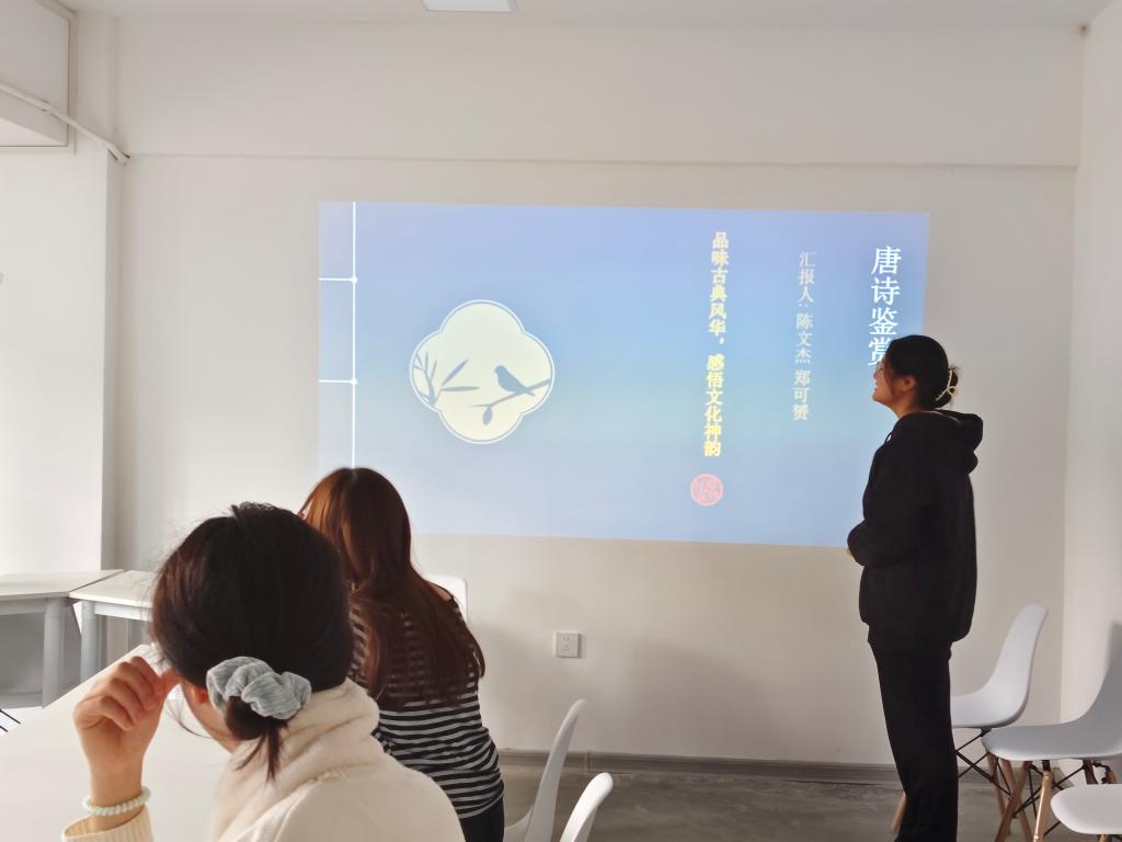 2024年11月19日下午,公司惊蛰悟美计划——“品味古典风华,感悟文化神韵”美育分享会第一期活动在一号楼一站式社区多功能研讨室1成功举办。此次活动旨在让同学们深入领略唐诗之美,提升文化素养与审美能力。来自语言文化公司的陈文杰和郑可赟同学担任此次活动的主讲人。