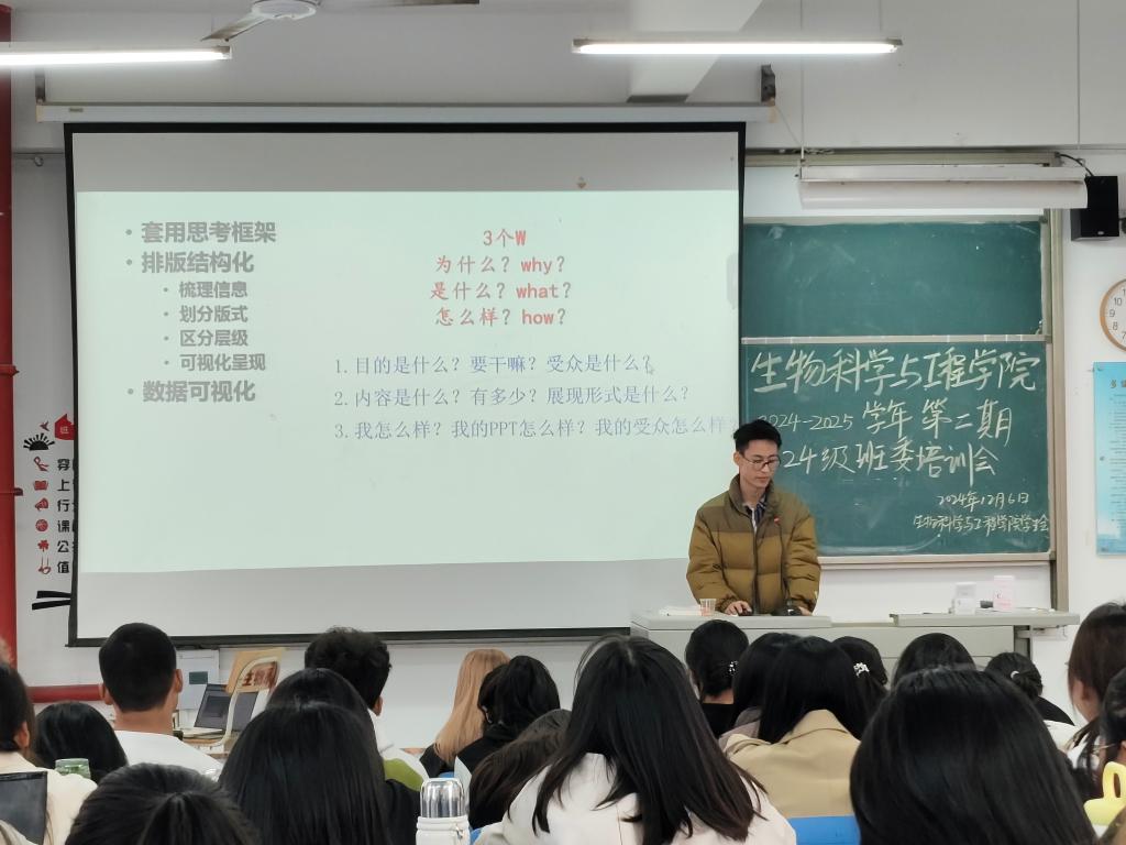 随后,黄金铭为班委们带来了精彩的 PPT 制作讲解。他通过实际案例与操作演示,深入浅出地介绍了 PPT 制作的技巧与要点,包括模板选择、文字排版、图片处理、动画效果等,帮助班委们掌握制作高质量 PPT 的方法,以便在今后的班级汇报、活动展示等工作中能够更加出色地完成任务。
