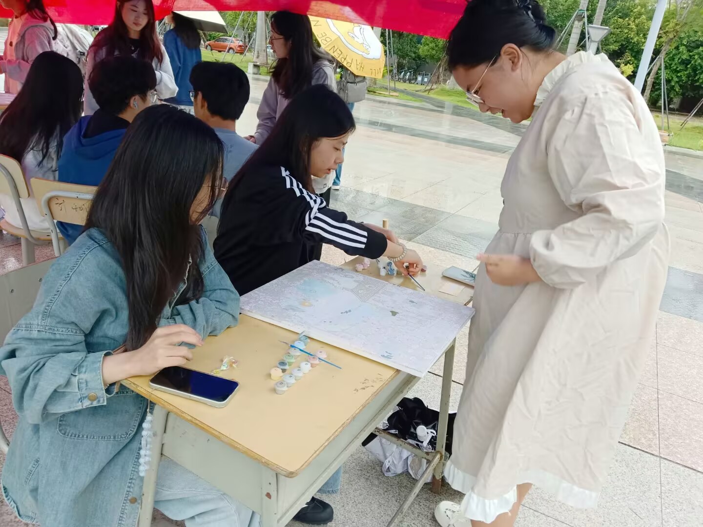 本次活动的主题是“秋色斑斓,欢乐共享”。活动以集章打卡的形式展开:参与者凭提前填写的收集表领取集章券,通过“校园晒秋”“非遗扎染”“拼首诗歌”“颜料画画”四个趣味环节即可集章抽奖。在“校园晒秋”区,同学们用丙烯马克笔在落叶上书写秋意诗句与祝福,将叶片拼贴成诗意“晒秋图”;“非遗扎染”环节中,工作人员讲解扎染技法后,同学们用皮筋、绳子创意扎结方巾,经蓝色染缸浸染,解锁了独属于自己的蓝白纹样;“拼首诗歌”区里,大家从文字胶带上选取词语,自由组合成灵动的三行短诗;“颜料画画”环节则以集体填色的方式,让同学们在协作中完成了一幅色彩斑斓的画布作品。