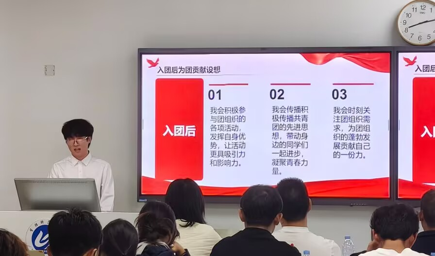 展示答辩大会上,团员发展对象们依次登台,以庄重的态度进行汇报。他们结合自身成长历程,深入阐述了对共青团的理解、入团动机、学业成就以及未来在思想、学业、服务同学等方面的规划,充分展现了青年一代积极向上、锐意进取的风采。
