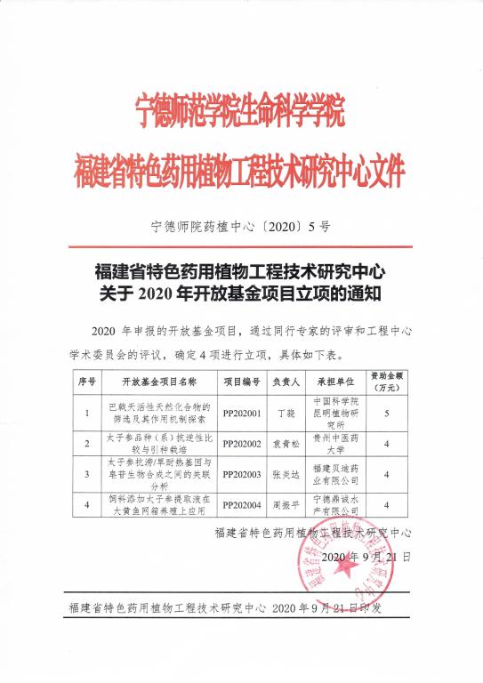 现将福建省特色药用植物工程技术研究中心关于2020年开放基金项目立项结果通知如下: