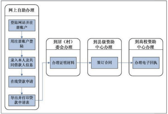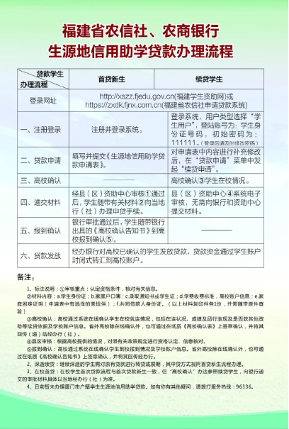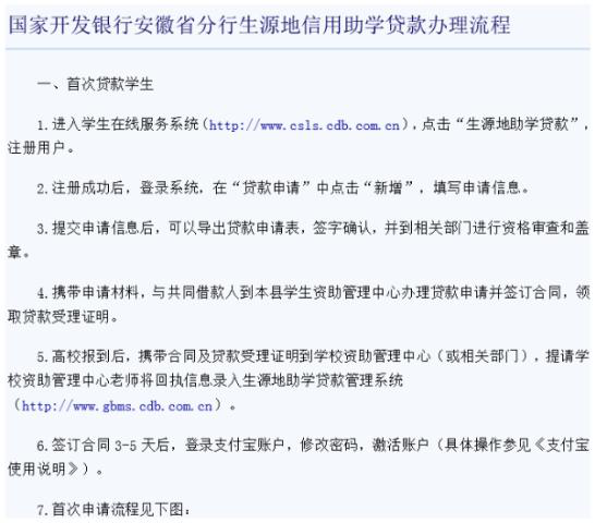 (3)办理手续:登录国家开发银行或者农村信用社(农商行)生源地助学贷款系统进行贷款申请,具体办理银行以当地教育局资助中心通知为准,银行生源地助学贷款系统网站如下: