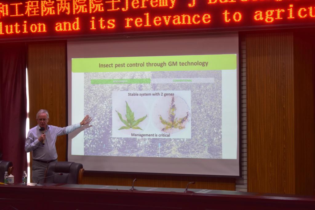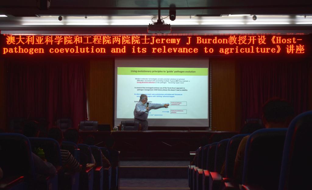 报告会上,Jeremy J Burdon教授以“寄主和病原物之间的关系”为切入点,指出植物病原物能引起植物发病,同时寄主植物自身也会发生相应的物理、化学和生理方面的变化阻遏病害的进一步扩展。同时从多个方面介绍了小麦叶锈病菌和寄主植物小麦间相互适应的过程,并在会后与师生们进行了深入的学术交流。