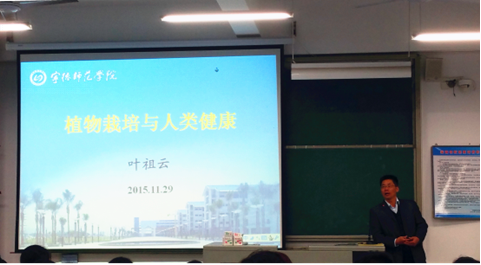 2015年11月29日晚7:00,叶祖云博士在求实楼CC201为我系员工开展题为《植物栽培与人类健康》的知识讲座。讲座上,叶祖云博士从植物与人类的关系、植物栽培方式、植物的脱病毒培养、如何培养出优良的植物植株以及内外现在植物的培养方式等方面想同学进行详细的解释。叶祖云博士还以目前正在研究的太子参为例,运用事实与同学们一起分享培养过程中遇到的问题和解决的方法。讲座结束后,叶祖云博士还与同学互相交流,深入探讨。通过此次讲座,同学从叶祖云博士身上学到的不只是知识经验,还有坚持不懈的精神,期待叶祖云下一次精彩有趣的讲座。