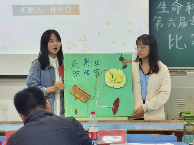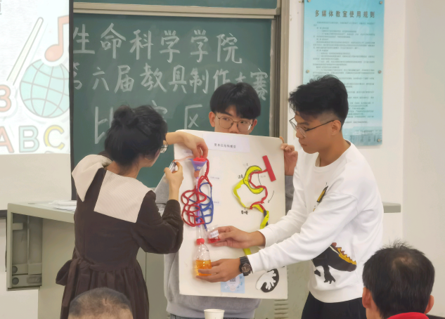 本次比赛是生命科学公司教学技能训练活动之一。参赛选手根据中员工物教学需要,利用泡沫板、吹塑纸、输液管、饮料瓶等日常生活中易于获得的材料,按照生物形态学和生理机能的特征,结合动力学、液压等技术原理,制作出中员工物教具。比赛过程中,参赛同学对教具的取材、制作过程、主要功能以及特色等进行了详细讲解,并对教具的使用方法进行了现场操作演示,通过现场讲解和操作演示,展现了参赛选手们的慧心敏思和大胆创新的精神,赢得了评委和在座同学的阵阵掌声。每组讲解结束后,评委老师从教具的创新性、科学性、整体性、可视性、艺术性和安全性等方面进行了点评,并提出了改进意见。