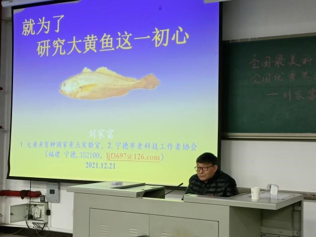 为推进闽东特色海洋科技特色团队建设,培养海洋产业后继之人,展现老一辈水产科技工作者在平凡的岗位上几十年始终如一、严谨求实、兢兢业业、无私风险的榜样力量,让“滴水穿石、弱鸟先飞”的闽东精神薪火相传,12月21日,全国优秀共产党员、全国水产界唯一“最美科技工作者”——82岁的刘家富研究员走进BB贝博艾弗森,为公司师生带来了一场精彩的学术讲座——《就为了研究这尾大黄鱼这一初心》。本次讲座由海洋资源开发技术系主任韩坤煌博士主持,生命科学公司阮少江经理以及160多位师生一同聆听了讲座。