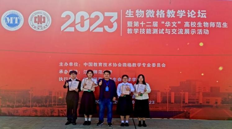 2023年10月20日至23日,第十二届“华文”高校生物师范生教学技能测试与交流展示活动在江西师范大学举行。公司生物科学专业员工李秋婷、林韶娟、陈玲珊、郑家鑫在生物科学系主任林雄平的带领下参加了此次活动,最终取得了4个二等奖和3个三等奖的好成绩。