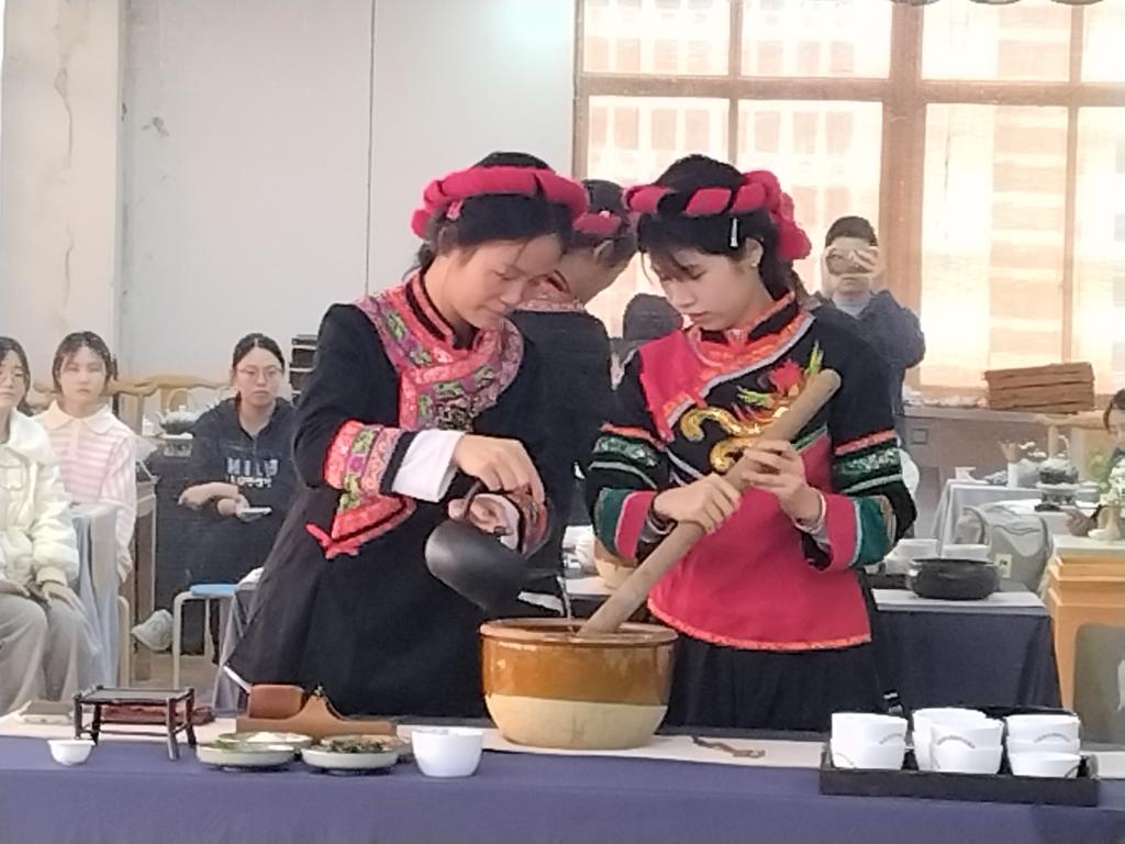 活动期间,2022级茶学专业的兰堂炜和2023级茶学专业的兰静云,作为畲族员工代表依次发言,分享了畲族的传统节日和风俗传统。随后,校茶艺队的肖舒婷和方清华同学身着畲族传统服饰,给支部成员展示畲族擂茶的制作技艺。首先,她们将白茶、花生、芝麻、薄荷叶等依次放入擂钵里充分研磨,佐以砂糖调味,而后沸水高冲,并用擂杵搅拌均匀,便成了一道既营养又可口的茶饮。在品鉴擂茶的过程的同时,支部成员围绕在新时代下如何深入挖掘和弘扬畲茶文化、如何运用自己的专业所长促进民族团结等主题开展讨论,大家纷纷表示,民族团结是国家长治久安的重要保障,而民族团结一家亲更是构筑和谐社会的基石,各族人民共同奋斗,共同发展,才能实现中华民族的伟大复兴。