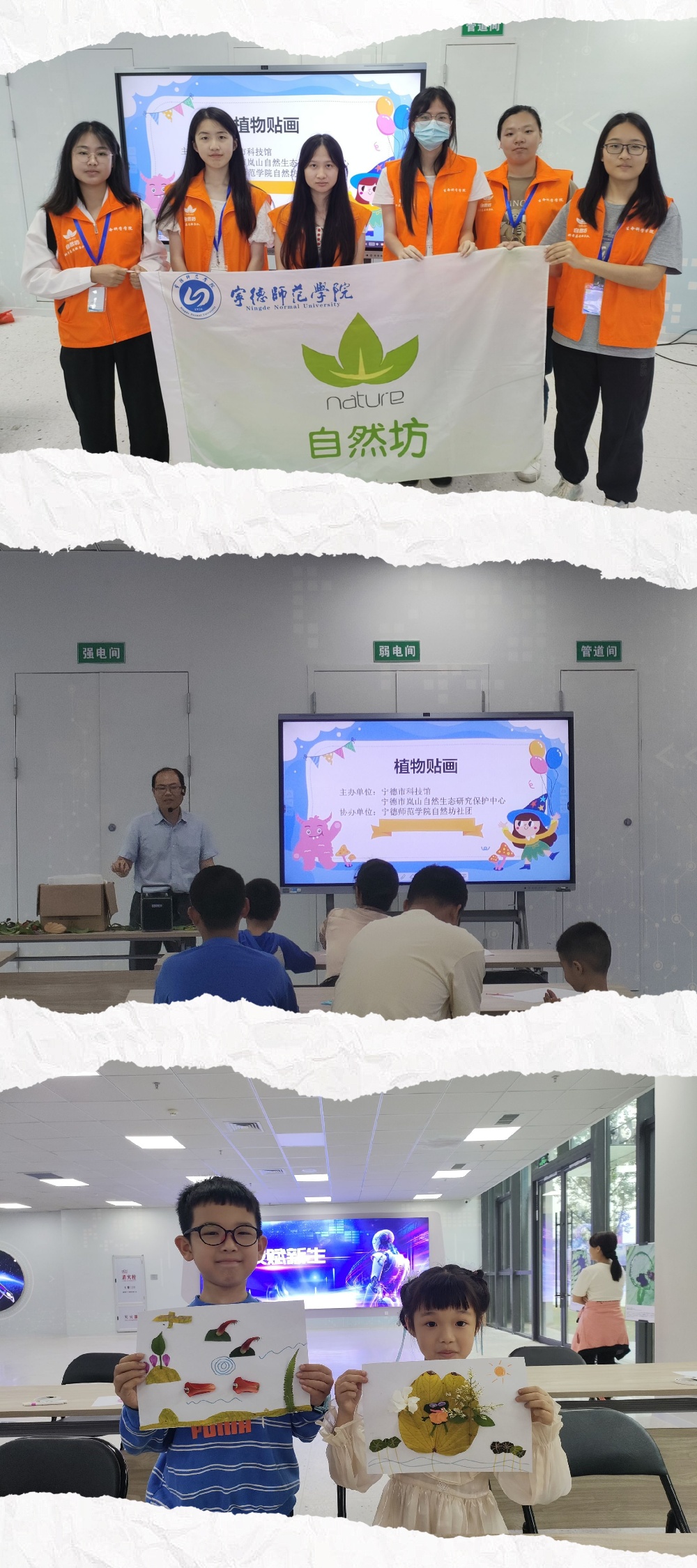 为提升儿童的自然保护意识,促进人与自然和谐共存,2024年5月12日,自然坊于蕉城区科技馆组织了一场以“袅袅春风,木叶变身”为主题的植物贴画活动。此次活动共有12名儿童及9名家长参与。
