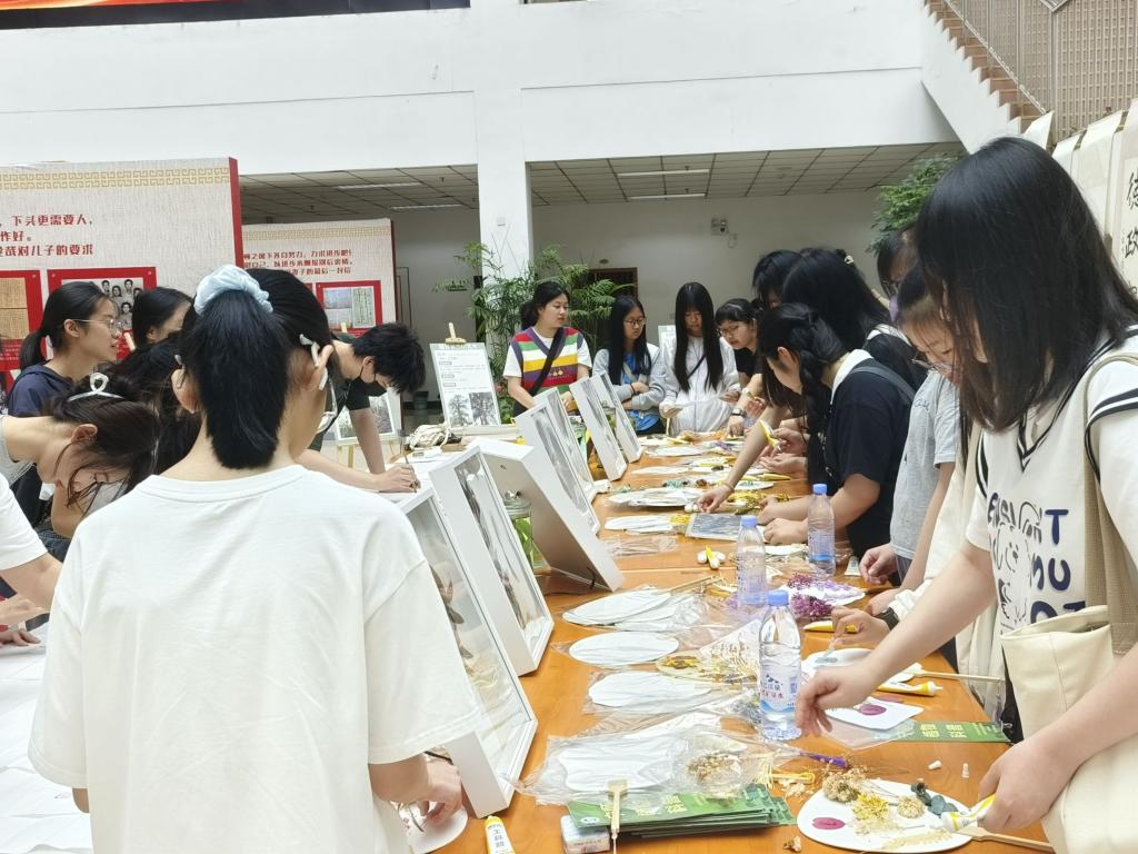 在活动中,自然坊主要负责“闽东特色植物标本的展示”与“压花团扇制作”两个项目模块。自然坊的志愿者们向同学们介绍了植物标本,并详细讲解了压花团扇的制作步骤和技巧。在他们的引导下,同学们积极动手尝试,相互交流学习,活动氛围热烈而和谐。