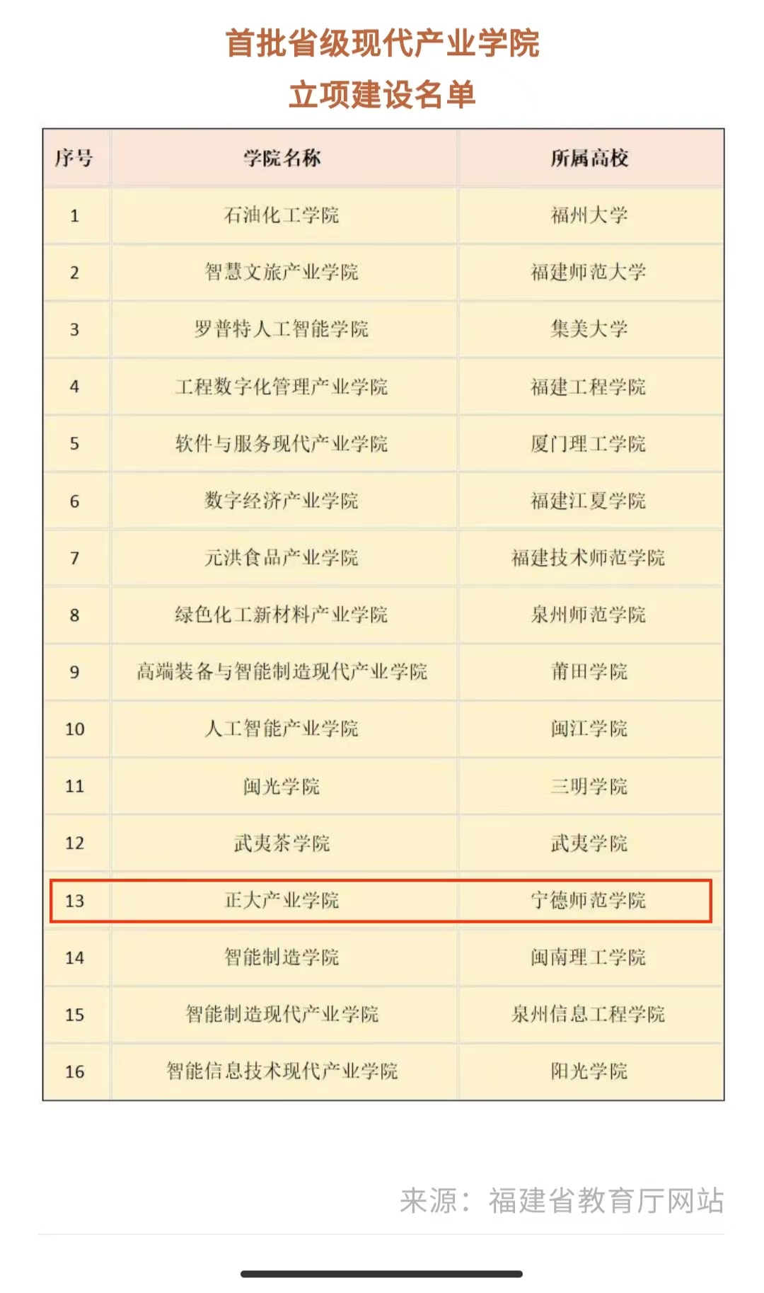 根据福建省教育厅《关于首批省级现代产业公司立项建设名单的公示》通知,公司与合作的福州大福有限公司等5家企业共同申报的正大产业公司,经专家评审,进入公示名单。