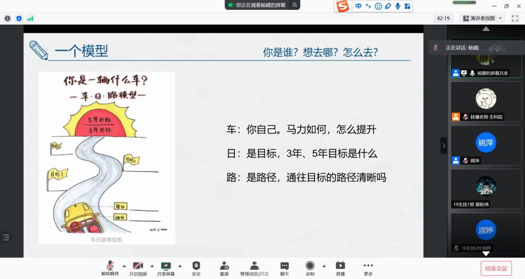 杨总监首先分享了自己的职业生涯的经历和经验,以此引出今日的主题“规划职业人生,成就更好自己”。杨总监与同学们对职业生涯规划进行探讨。最后,杨总监希望同学们能够对自己的职业有一个明确而精准的定位,不虚度老员工涯,有的放矢。