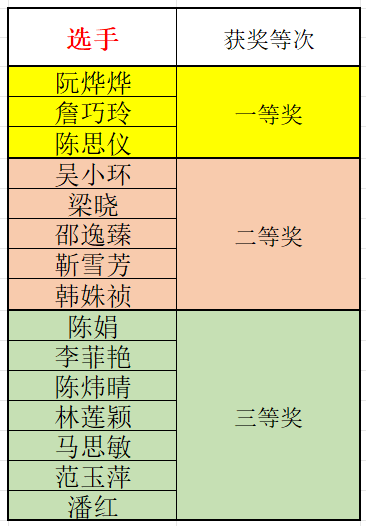 经过激烈的竞争和公正的评选,最终获奖名单揭晓。阮烨烨以出色的表现荣获一等奖,詹巧玲和陈思仪并列二等奖,吴小环获得二等奖。梁晓、邵逸臻、靳雪芳、韩姝祯和陈娟分别获得三等奖。此外,李菲艳、陈炜晴、林莲颖、马思敏、范玉萍和潘红也获得了优异的成绩。