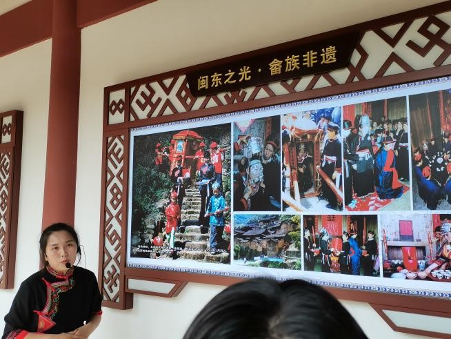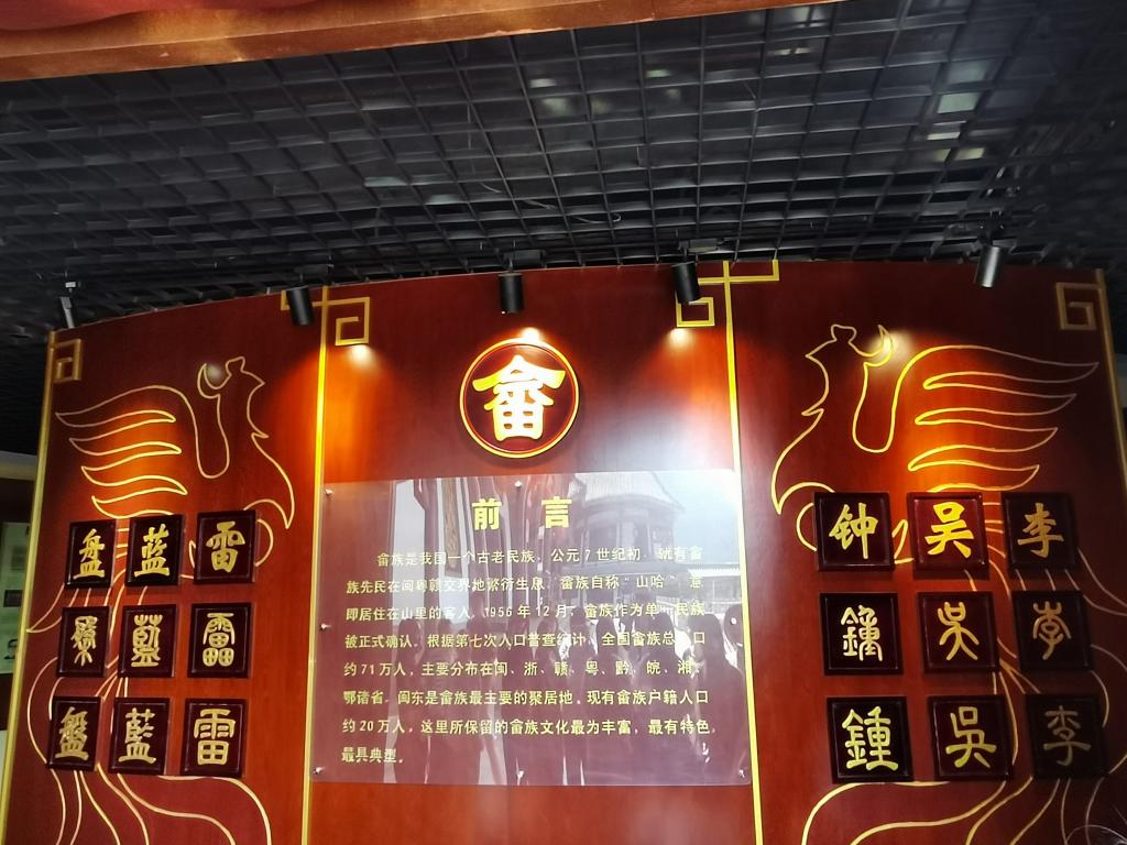 走进畲族宫的大门,我们先是来到东侧文化长廊,在讲解员的讲解下,我们了解了其墙面布设版面34个,主要展示闽东畲族乡村自然和人文景观、非物质文化遗产、民俗风情等。长期在山区艰苦劳动和生活,磨砺出畲族群众的聪明才智,沉淀出许多非物质文化遗产。