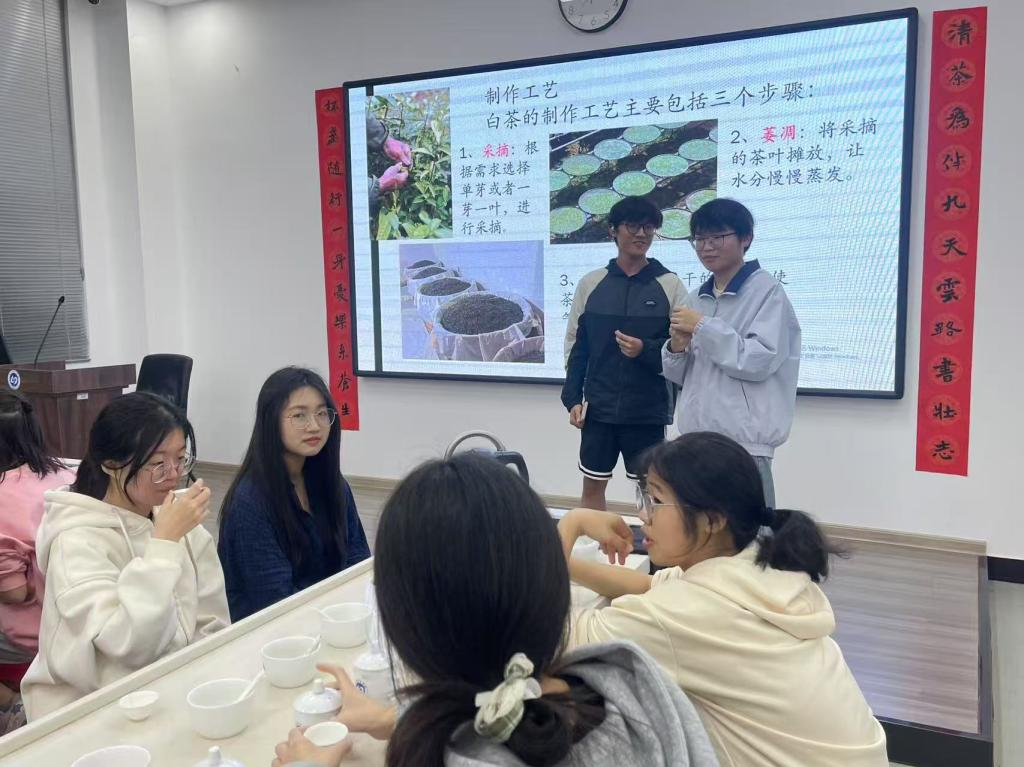活动现场布置得简约而不失雅致,白茶的清香随着轻风飘散在空气中,营造出一种宁静而祥和的氛围。茶协会会长陈伟国首先为参与者们介绍了白茶的简介、分类以及功效,深入浅出的讲解让在场的每一位参与者都对白茶有了更深入的了解。为了让参与者们更直观地感受白茶的魅力,活动现场特设了白茶展区。展区中,各种白茶佳品如白毫银针、寿眉、白牡丹等琳琅满目,让参与者们有机会近距离欣赏白茶的秀美外形,感受其独特的香气和口感。在品茶环节,同学们一边细细品味着白茶的清香,一边与茶协会的工作人员进行了深入的交流。大家共同探讨白茶的种植、加工和品鉴之道,现场气氛热烈而融洽。