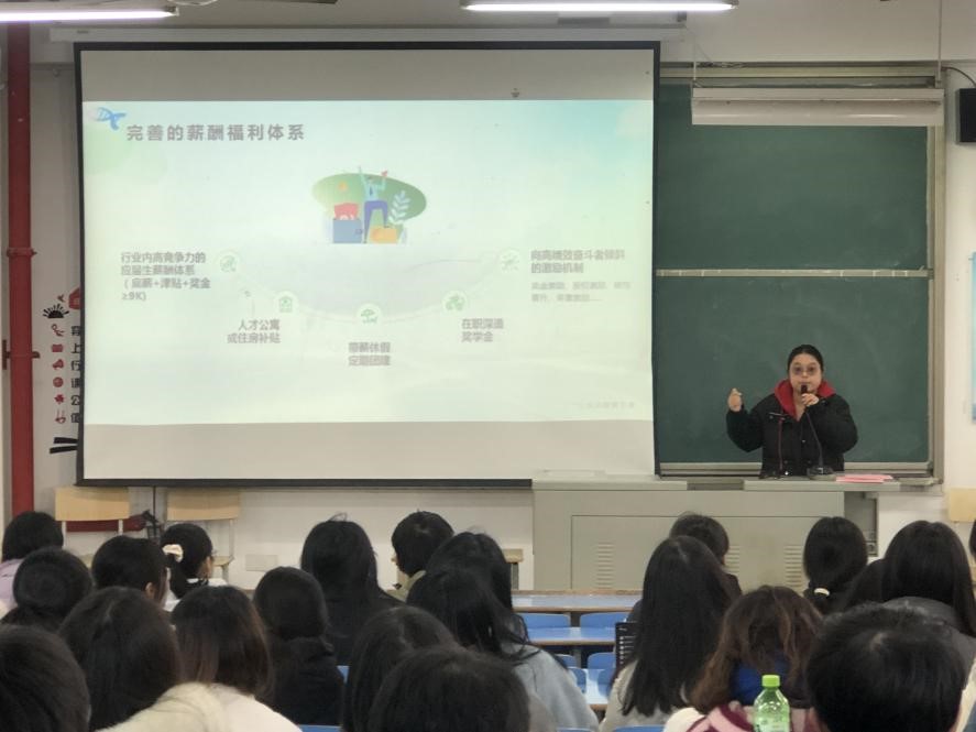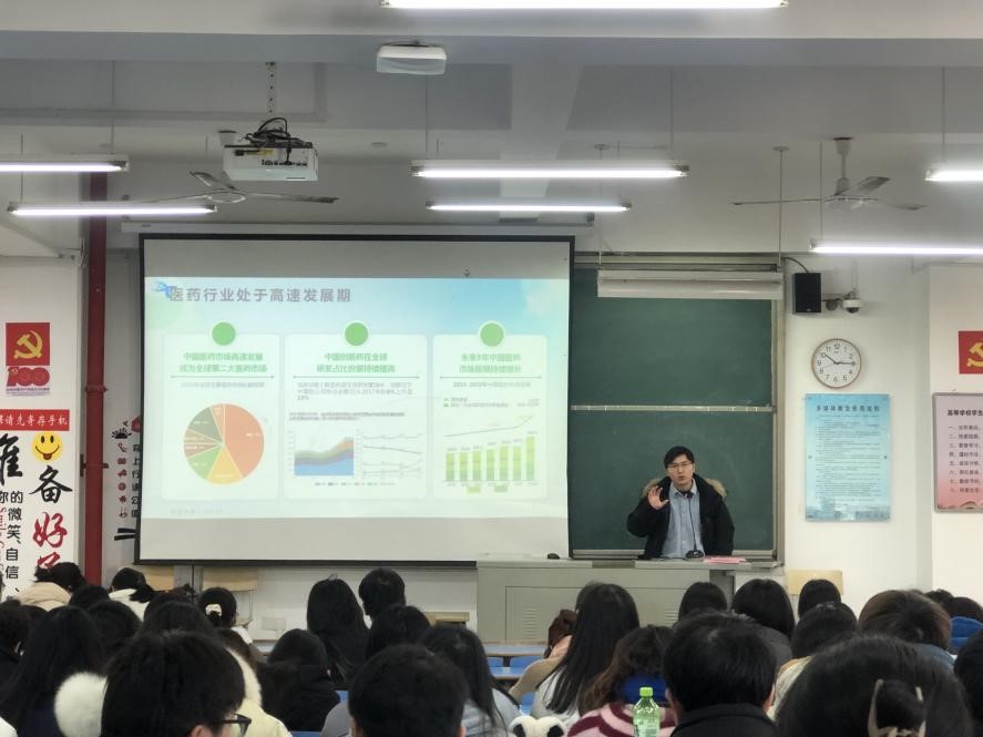 宣讲会开始由先声药业营销系统招聘负责人韩鑫介绍了公司的背景,江苏先声药业有限公司是连续多年位居“中国创新力医药企业十强”和“中国制药工业百强”的创新型制药公司。韩鑫还讲述到药业是需要科研和创造的行业,而江苏先声药业有限公司就是创新型药企。接着,韩鑫概述了公司近十年来的创新型药物并强调公司招聘人员大多数来自于校招,推行就业一体化。同时,他向同学们介绍了多元且富有经验的高管团队,以及完善的薪酬福利体系,例如应届生薪酬体系、住房补贴、带薪休假定期团建等等。在宣讲会最后,由公司业务经理游诗华做经验分享。